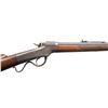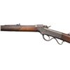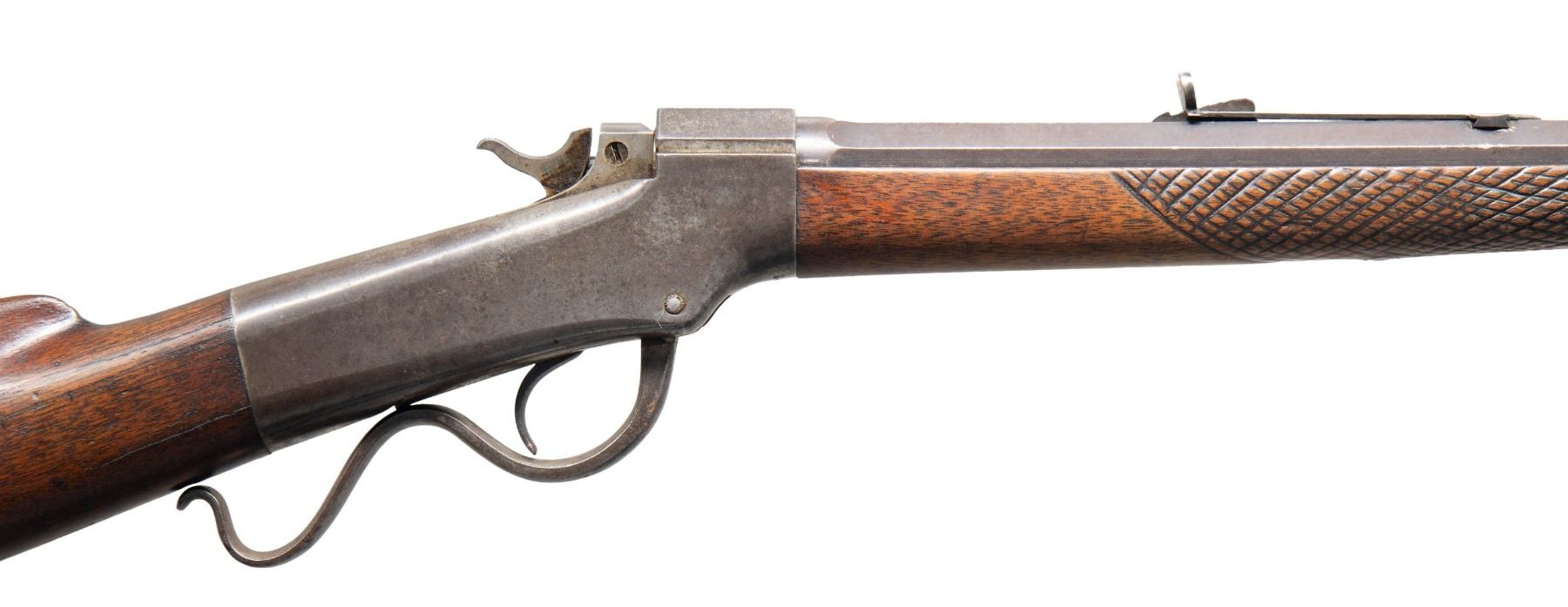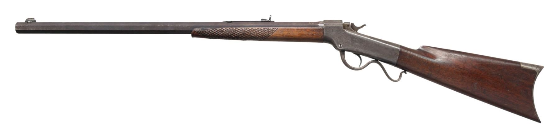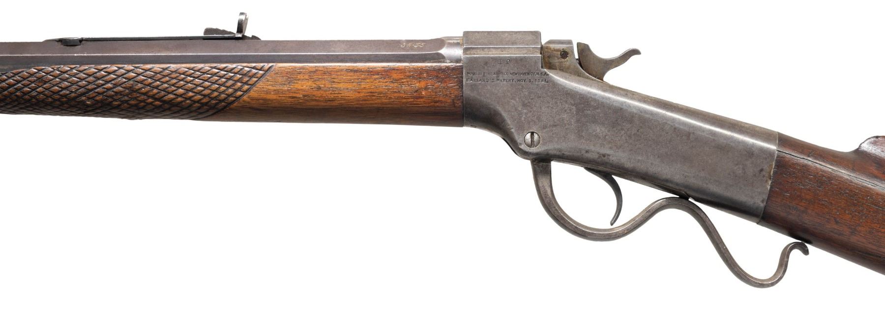 RIFLE. Cal. 38-55 (originally 32-40). S# 24850. J.B." stamp on barrel & receiver appears to be the converter's stamp from 32-40 Ballard rifle to 38-55. Oct. barrel cut down to 24.25". New dovetail cut with vintage blade front sight along with original elevator rear sight. Ballard's patent single shot action with 2 open holes for sight. Walnut stock set w/ hobbyist checkering on forearm & crescent buttplate. CONDITION: good blue on barrel in protected areas with balance being a mixed of brown patina & fair faded blue showing series of deep marks & scratches. Receiver has gray/brown patina appearance. Forearm has worn appearance with large chip on left side & large crack right side. Buttstock has large cracks through wrist & numerous marks. Very good rifling. PROVENANCE: Estate of Groves Herrick. (01-28372/MD). ANTIQUE. $400-600.