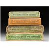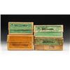 Very good 20 round 2 piece boxes with minimal scuffs; partials and mixed lots noted. 1). 38-56 Win. green labeled box with small retailer label from J. W. Nelson of Duluth, Minn. Water stains on box having 10 rds. of UMC with lead bullets (light powdery oxidation) plus 10 rds. WRA Co. marked having jacketed (silver colored) bullets and patina appearance. 2). 38-56 Win. with WRA Co. headstamps and jacketed (silver colored) bullets. Exceptional condition on 19, and 1 with very slight patina and mild flattening of lead tip. Very minimal spot of water staining on box. 3). 38-72 Win. in orange labeled box having cursive "Box # 136" on plain side of cover. Ammo and box are in remarkably nice condition. 4). 38-55 Win. in very nice green labeled box. 17 rds. are much later production with "W-W" headstamps and modern flat topped primers. 2 rds. have early domed primers and "WRA" headstamp. 1 rd. has early domed primer and "WRA Co." headstamp. PROVENANCE: The Esteemed Norm Greenberg Collection. (02-24841-2/NW). $350-500.