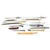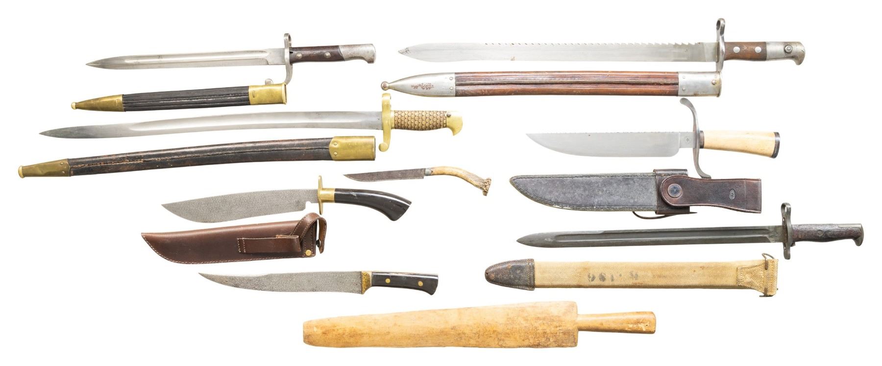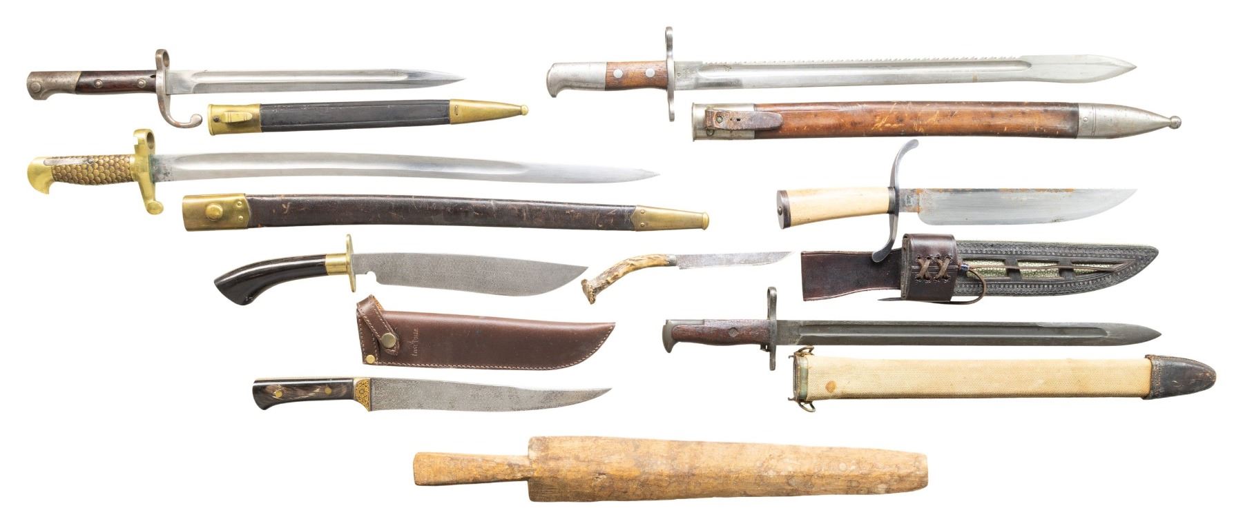 1 Wooden knife dummy approx. 21" long. CONDITION: bayonets & knife appear good with some examples showing oxidation & wear to scabbards & sheaths. (02-25549-1/MD). $300-500.