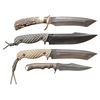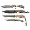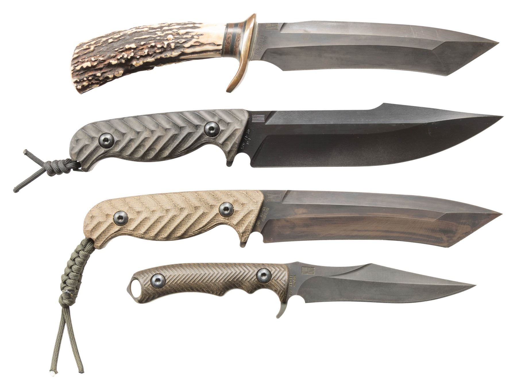 4) BUSHIDO. Mfg. June 2016, S# 070. Re-curve 7" tanto point blade. Brass guard w/ black & wooden washer ferrule. Stag handle with brass pin. CONDITION: knives appear very good to near excellent with light handling wear. (02-25176/MD). NON-GUN. $800-1,200.