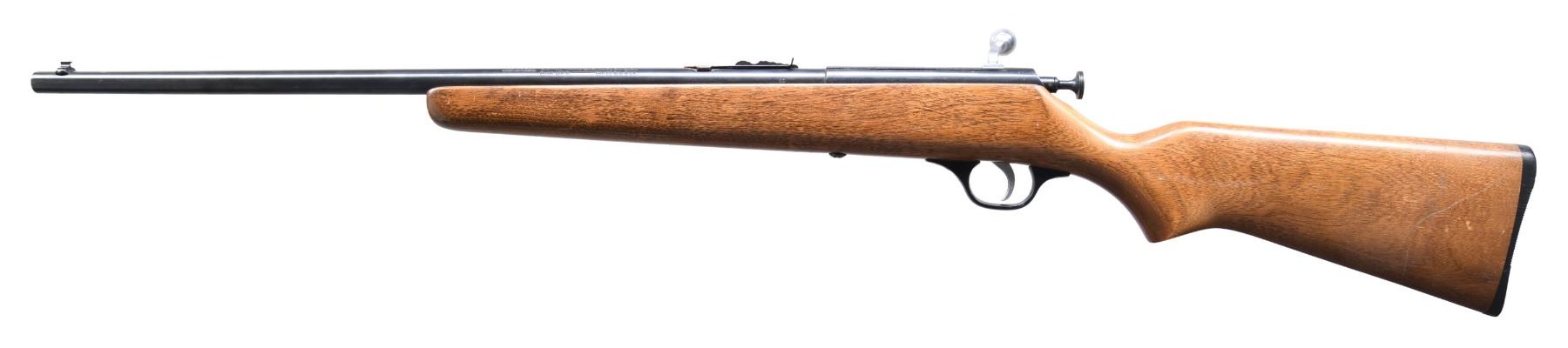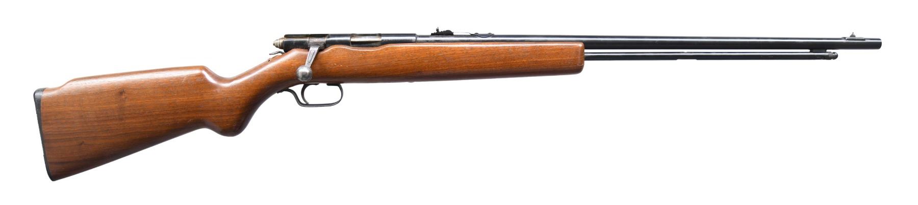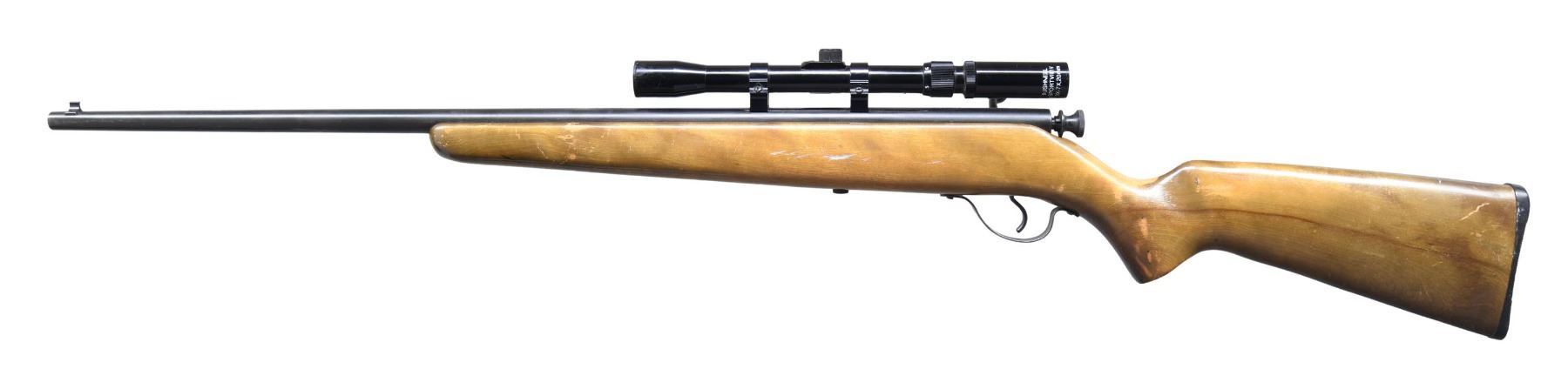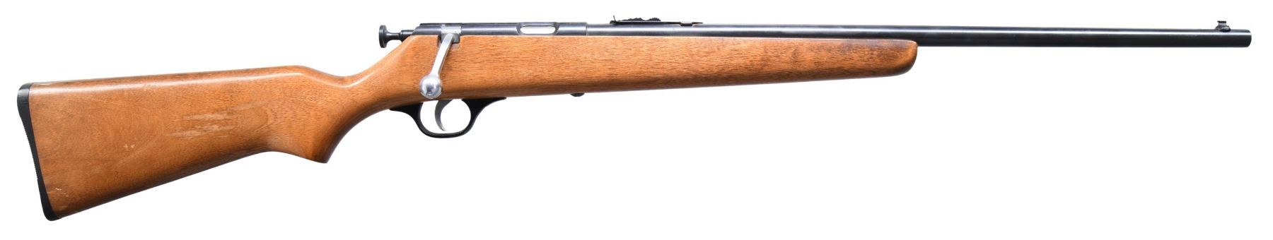 1) WESTERN FIELD M820A. Cal. 22 S, L, LR. S#P439711. Barrel 25.5". Broken post front sight & elevator rear sight. Tubular mag. Grooved receiver. Walnut stock. CONDITION: very good wood & metal finish with handling marks. Very good bore. (25-685/MD). 2) FN 1912. Cal. 22 LR. NSN. Barrel 23 3/4". Bead front & notch rear sight. Manually cocking bolt. Walnut stock. CONDITION: fair blue. Stock has pinned crack at top of wrist; fair finish. Fair bore. (25-696/MD). 3) SPRINGFIELD / SAVAGE MODEL 120 SERIES A RIFLE. Cal. 22 S, L, LR. NSN. Barrel 23.5". Blade front sight. Bushnell Sportview 3-7x20 scope with duplex reticle on tip off rings. Hardwood stock. CONDITION: Very good blue. Fair wood finish. Shiny bore. (25-705/MD). 4) MARLIN GLENFIELD 100G. Cal. 22 S,L, LR. NSN. Barrel 22". Sporting sights. Grooved receiver. Hardwood stock. CONDITION: good metal & wood finish with handling marks. Shiny bore. (24-718/MD). ALL CURIO. $500-800.