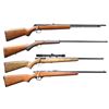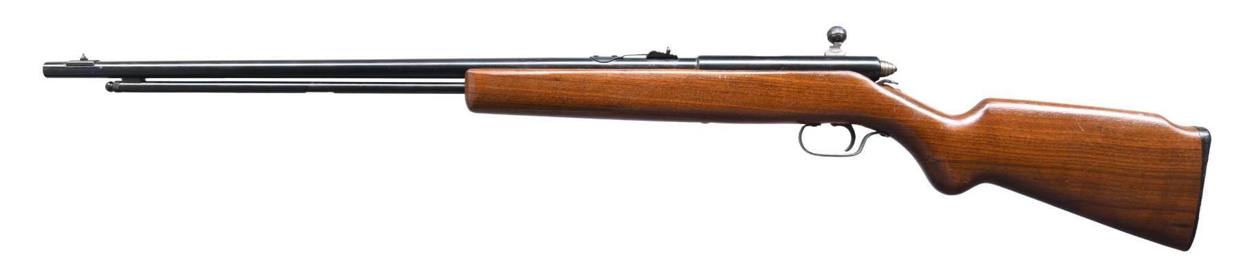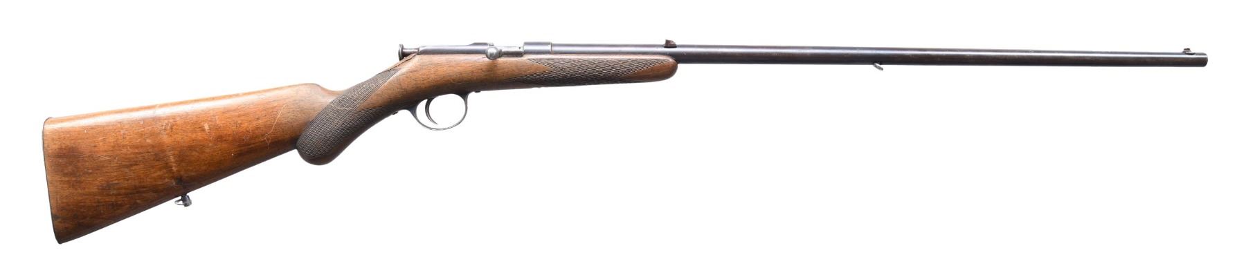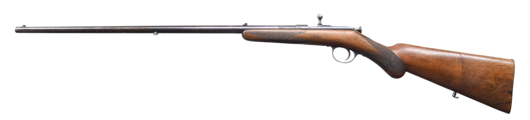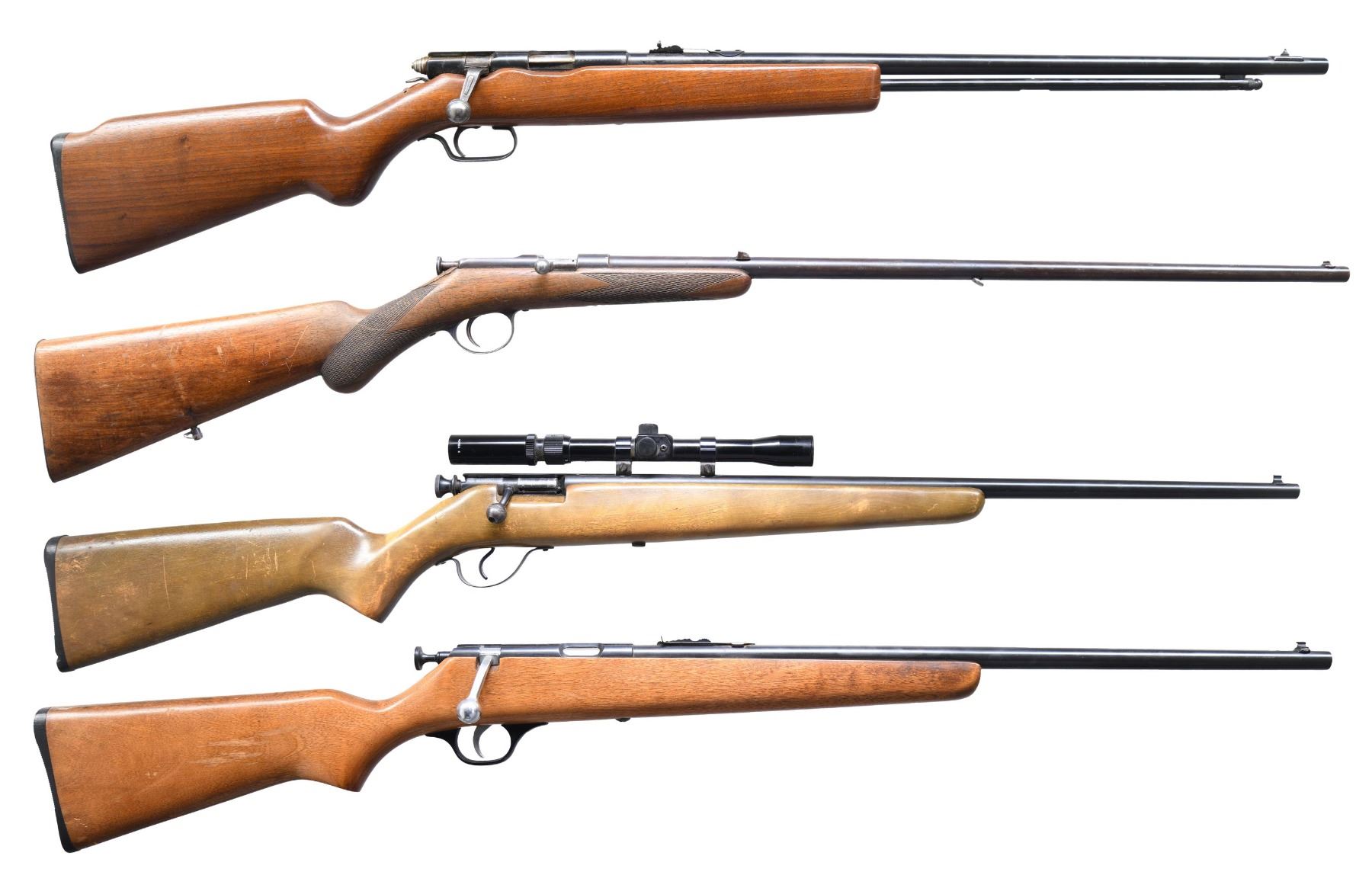 1) WESTERN FIELD M820A. Cal. 22 S, L, LR. S#P439711. Barrel 25.5". Broken post front sight & elevator rear sight. Tubular mag. Grooved receiver. Walnut stock. CONDITION: very good wood & metal finish with handling marks. Very good bore. (25-685/MD). 2) FN 1912. Cal. 22 LR. NSN. Barrel 23 3/4". Bead front & notch rear sight. Manually cocking bolt. Walnut stock. CONDITION: fair blue. Stock has pinned crack at top of wrist; fair finish. Fair bore. (25-696/MD). 3) SPRINGFIELD / SAVAGE MODEL 120 SERIES A RIFLE. Cal. 22 S, L, LR. NSN. Barrel 23.5". Blade front sight. Bushnell Sportview 3-7x20 scope with duplex reticle on tip off rings. Hardwood stock. CONDITION: Very good blue. Fair wood finish. Shiny bore. (25-705/MD). 4) MARLIN GLENFIELD 100G. Cal. 22 S,L, LR. NSN. Barrel 22". Sporting sights. Grooved receiver. Hardwood stock. CONDITION: good metal & wood finish with handling marks. Shiny bore. (24-718/MD). ALL CURIO. $500-800.