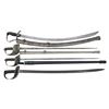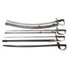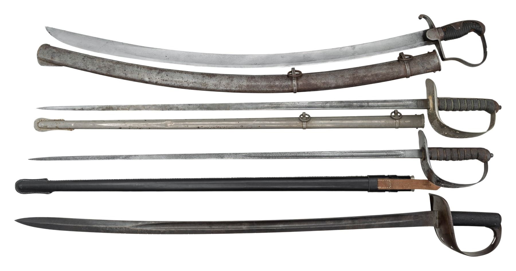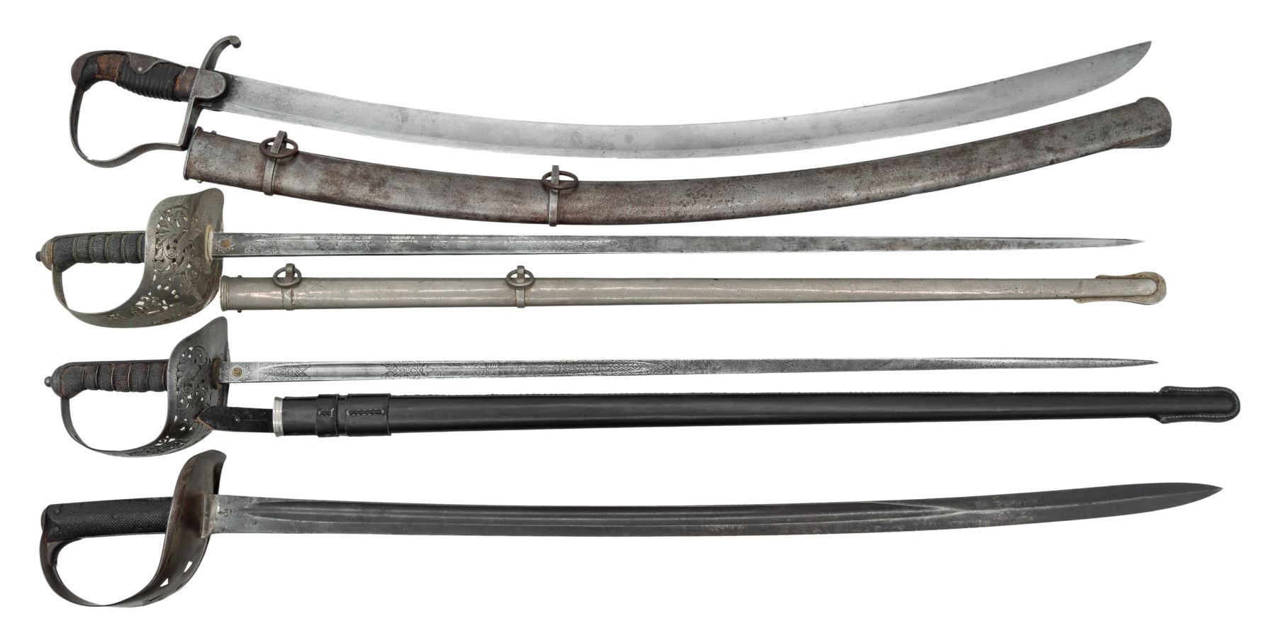 1) British M1885 Cavalry saber measuring 40" overall with a plain blade with a broad arrow and arsenal marks at the ricasso. Sheet iron guard with 4 triangular piercings. 2-piece composite grip and no Scabbard. CONDITION: blade has an overall dark patina as does the hilt. Grip has minor losses to the edges. 2) Prussian M1811 Heavy Cavalry saber measuring 40" overall with a plain single wide fullered blade. Iron hilt with plain langets and ears on the backstrap. Leather grip with an iron scabbard. CONDITION: blade has a light gray cleaned patina. Hilt and scabbard have a medium gray patina. The grip leather is 80% complete. 3) British M1897 Infantry officer's sword measuring 40" overall with an etched blade marked near the hilt " HAWKES & CO. PICCADILLY LONDON ". Etching includes a crowned "ER VII ", crowned royal arms, and various foliate motifs. Plated sheet iron guard with multiple piercings that include a crowned ER VII. Wire wrapped shark skin grip with a plated scabbard. CONDITION: blade has a light gray patina. The hilt and scabbard show light wear. 4) British M1895 Infantry Officer's sword measuring 40" overall with an etched blade stamped "4426" on the spine. Etching includes a crowned "GR V ", crowned royal arms, and various foliate motifs. Sheet iron guard with multiple piercings that include a crowned GR V. Wire wrapped shark skin grip with a black leather scabbard that may be a replacement. CONDITION: blade has a light gray patina. The hilt shows light wear and the scabbard is like new. (02-25860/BF). NON-GUN. $500-800.