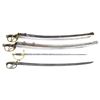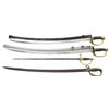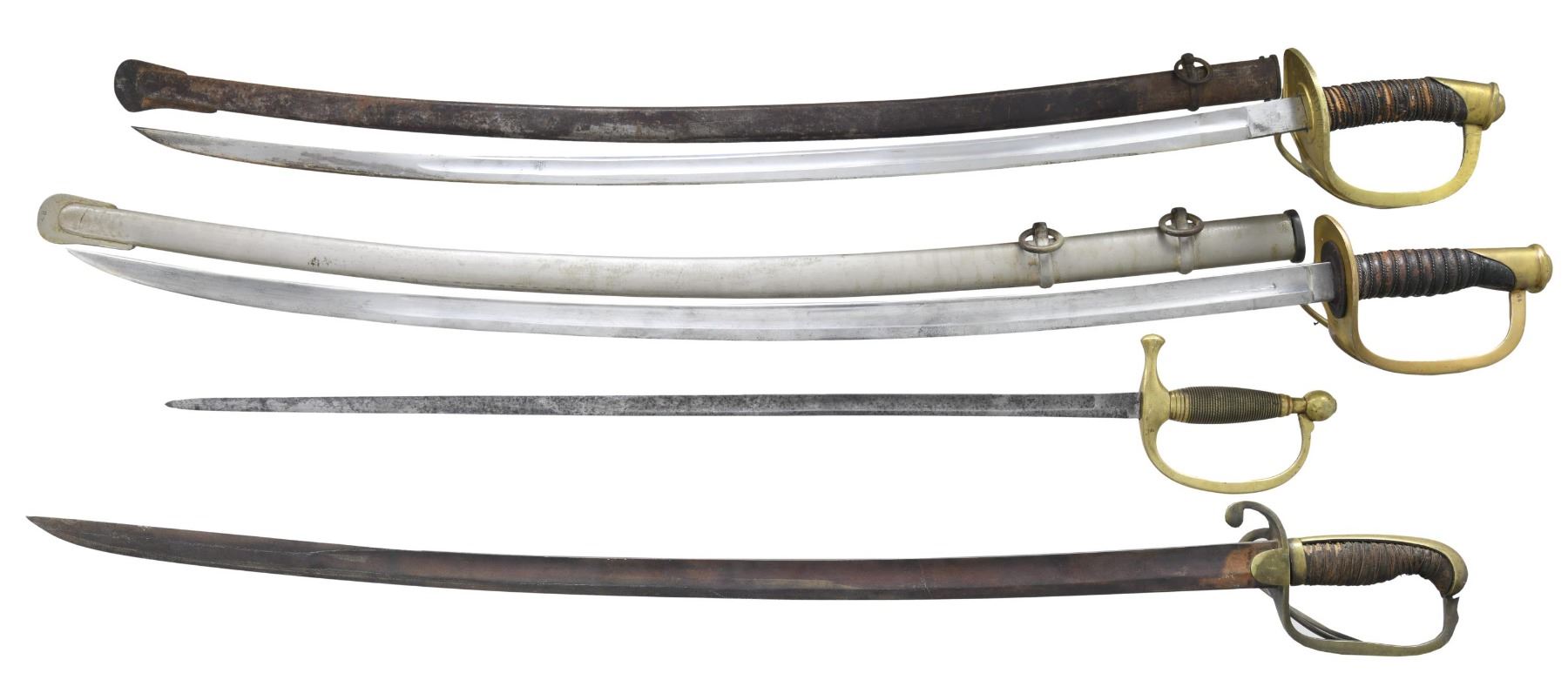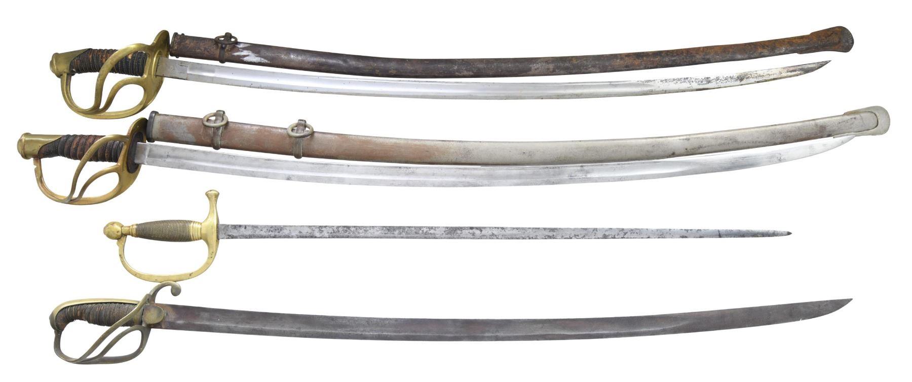 1) M1860. Overall length: 39 1/2". Blade length: 33". An import cavalry saber featuring a plain blade with a single wide fuller and a secondary fuller near the spine. The ricasso is stamped "(squirrels) R&B" and "(liberty cap) LIBERTAD R.M.". Brass hilt with a 2-branch semi-basket guard. The underside of the guard is stamped "GEN. KEO. 14.". Wire wrapped leather grip. Iron scabbard. CONDITION: blade has a clean finish with some staining near the tip, and the blade does show evidence of sharpening. Hilt shows light wear. Grip leather is about 60% but the wire is complete. Scabbard has a dark finish with some oxidation and a few shallow dents. 2) M1840. Overall length: 33 1/2". Blade length: 27 3/4". An enlisted musician's sword with a plain blade featuring a single medium fuller. The blade is stamped "N.J" on the ricasso, indicating issuance by the state of New Jersey. Solid brass hilt with simulated wire wrapped grip. No scabbard. CONDITION: blade has a medium gray mottled patina. Hilt has a pleasing light mustard patina. 3) M1860. Overall length: 42 1/2". Blade length: 34 5/8". A cavalry saber with a plain blade featuring a single large fuller and a secondary fuller near the spine. The ricasso has a worn mark that is obviously for Emerson & Silver. The other side is marked "U.S." and "1864". Brass hilt with a 2-branch semi-basket guard. Wire wrapped leather grip. This sword has a incorrect, but original, M1906 scabbard. CONDITION: blade has a light gray finish with light spotty staining. Hilt shows light wear. Grip is complete but shows wear and wire is 100%. Scabbard shows light oxidation towards the top. 4) MILITIA. Overall length: 39". Blade length: 33 1/2". A militia style artillery saber featuring an engraved blade that has a single wide fuller. The engraving appears to include various foliate motifs and sprays of arms. Brass hilt with a 2-branch semi-basket guard and a sharply downturned pendulous quillon. Wire wrapped leather grip. No scabbard. CONDITION: blade has a dark gray patina, is a bit bent, and its engraving is somewhat obscured. Hilt is quite solid but is slightly misshaped. Grip is about 60% but the wire appears complete though dislodged. (02-23828/BF). $700-1,000.