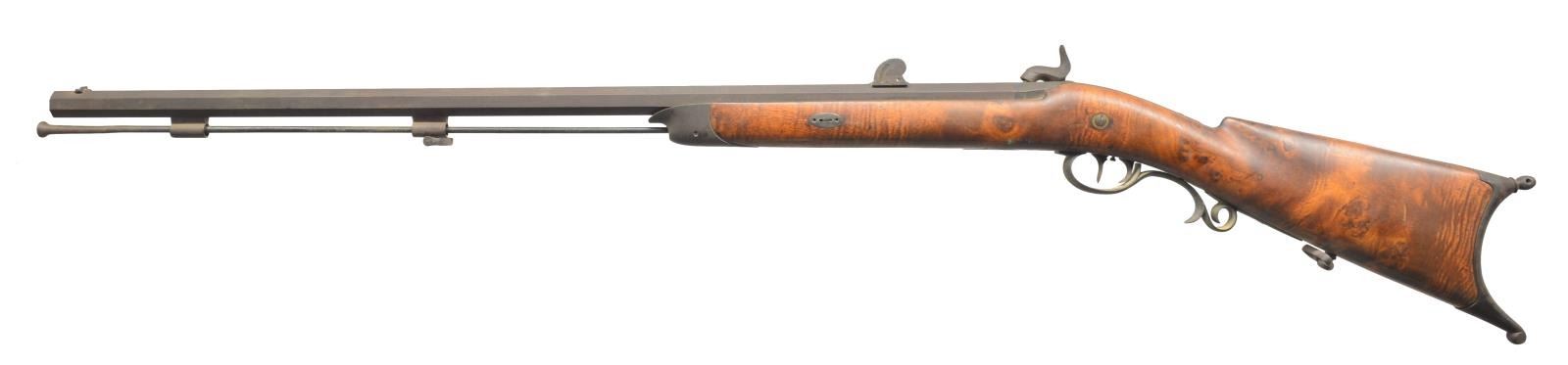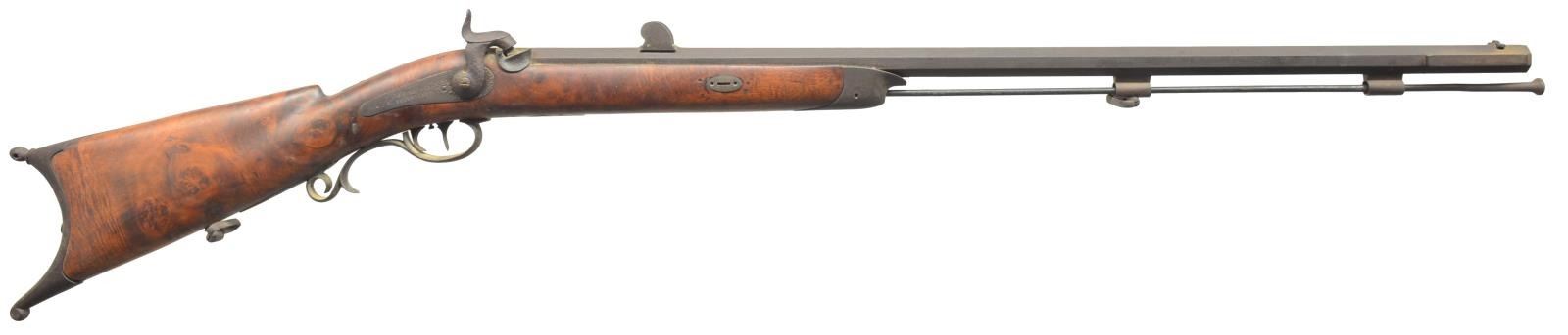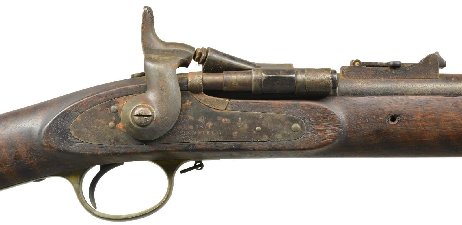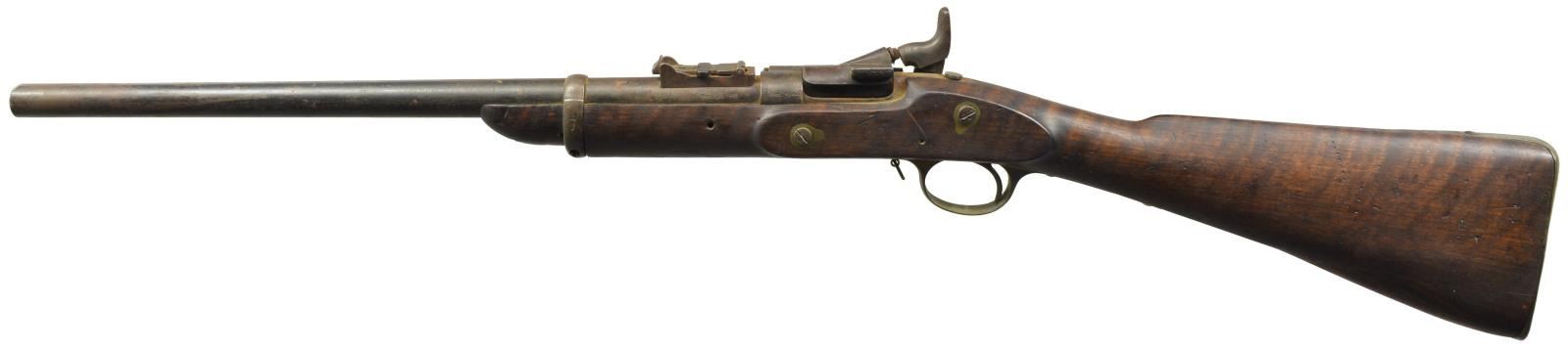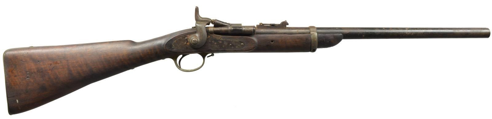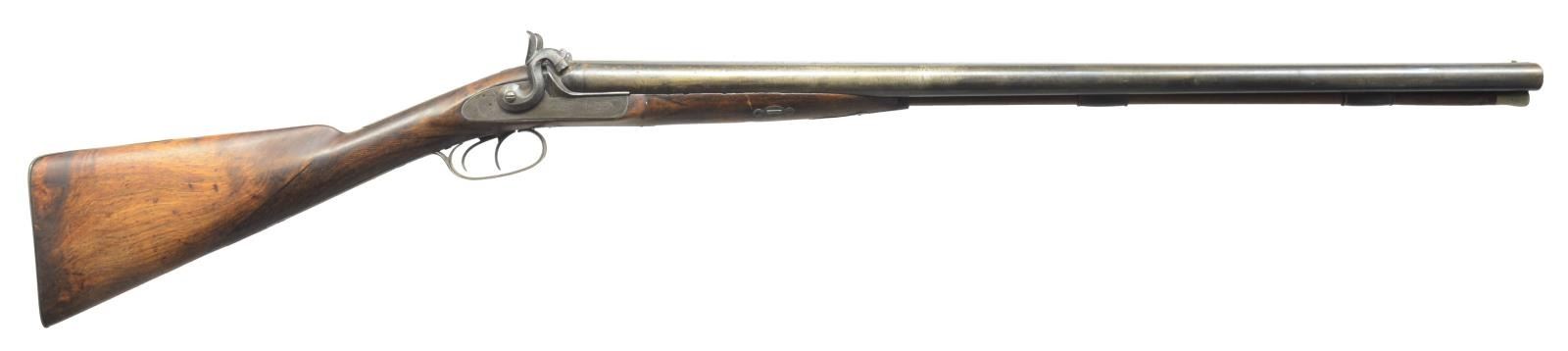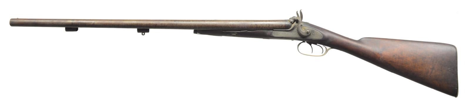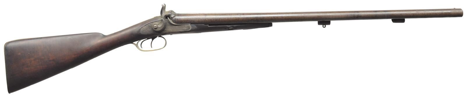 1) ENFIELD 1871 SNIDER CARBINE. Cal. 577 Snider. NSN. Bbl. shortened to 19 3/8". Stock is shortened to carbine length forward of rear band. CONDITION: metal has a mottled brown appearance w/ scattered pitting & surface corrosion. Brass buttplate shows heavy dents. Sanded & refinished stock has lg. piece of added wood repair along buttplate toe to mid point of toeline. Lock will not cock or fire. Dark heavily pitted bore. (01-17825/DS). 2) BELGIAN HAMMER PERCUSSION SXS SHOTGUN. Cal. 10 Ga. NSN. Bbls. 28" of twist steel. Sidelock action w/ ornate dog's head hammers having highlights of scroll engraving that extends to top tang, trigger plate & trigger guard bow. Key fastened straight hand walnut stock w/ steel shotgun buttplate. CONDITION: metal finish is fading to a mottled gray/brown. Nipples are hammered down. Left hammer has incorrect replacement screw. Stock has dark worn heavily sanded appearance w/ lg. chips in forearm, lock & buttplate areas. Ramrod & right key escutcheon is not present. Rusty bores. (01-17829/DS). 3) JJ REIDER HALF STOCK PERCUSSION RIFLE. Cal. 40. NSN. Bbl. 33 1/4" oct. Blade front sight w/ base only for folding leaf rear sight. Island lock marked "JJ REIDER / A. INTERLAKEN". Dbl. set triggers. Key fastened stock of fancy walnut w/ iron fittings that consist of hook buttplate, finger curl trigger guard, nose cap, key escutcheons & sling swivels. Button tipped iron ramrod held by 2 plain pipes. CONDITION: metal has a dark crusty appearance w/ areas of pitting most prevalent at lock & breech areas. Sanded & refinished stock. Functioning lock. Dark pitted bore. (01-17830/DS). 4) MOORE & CO. PERCUSSION SXS SHOTGUN. Cal. 11 Ga. S# 2833. Bbls. 28 3/4" of twist steel. Tasteful engraved sidelock marked "Moore & Co / London". Key fastened straight hand stock of fancy English walnut w/ steel shotgun buttplate. Replacement hardwood ramrod held by 2 pipes. CONDITION: metal has mottled gray appearance w/ touch up blue application. Stock is heavily sanded & refinished w/ some remaining checkering & handling marks. Functioning locks. Dark pitted bores. (01-17831/DS). ALL ANTIQUE. $450-950.