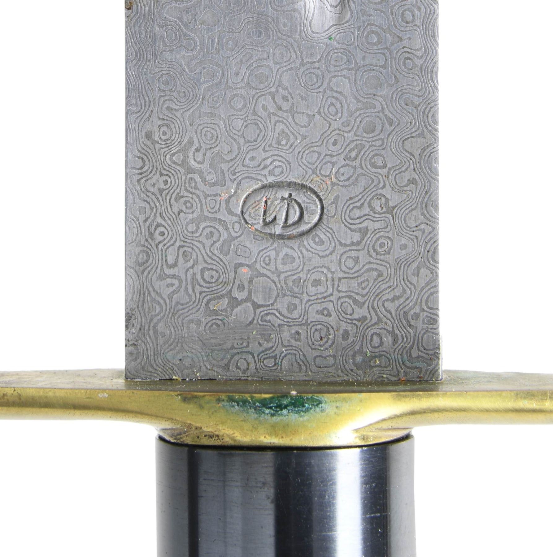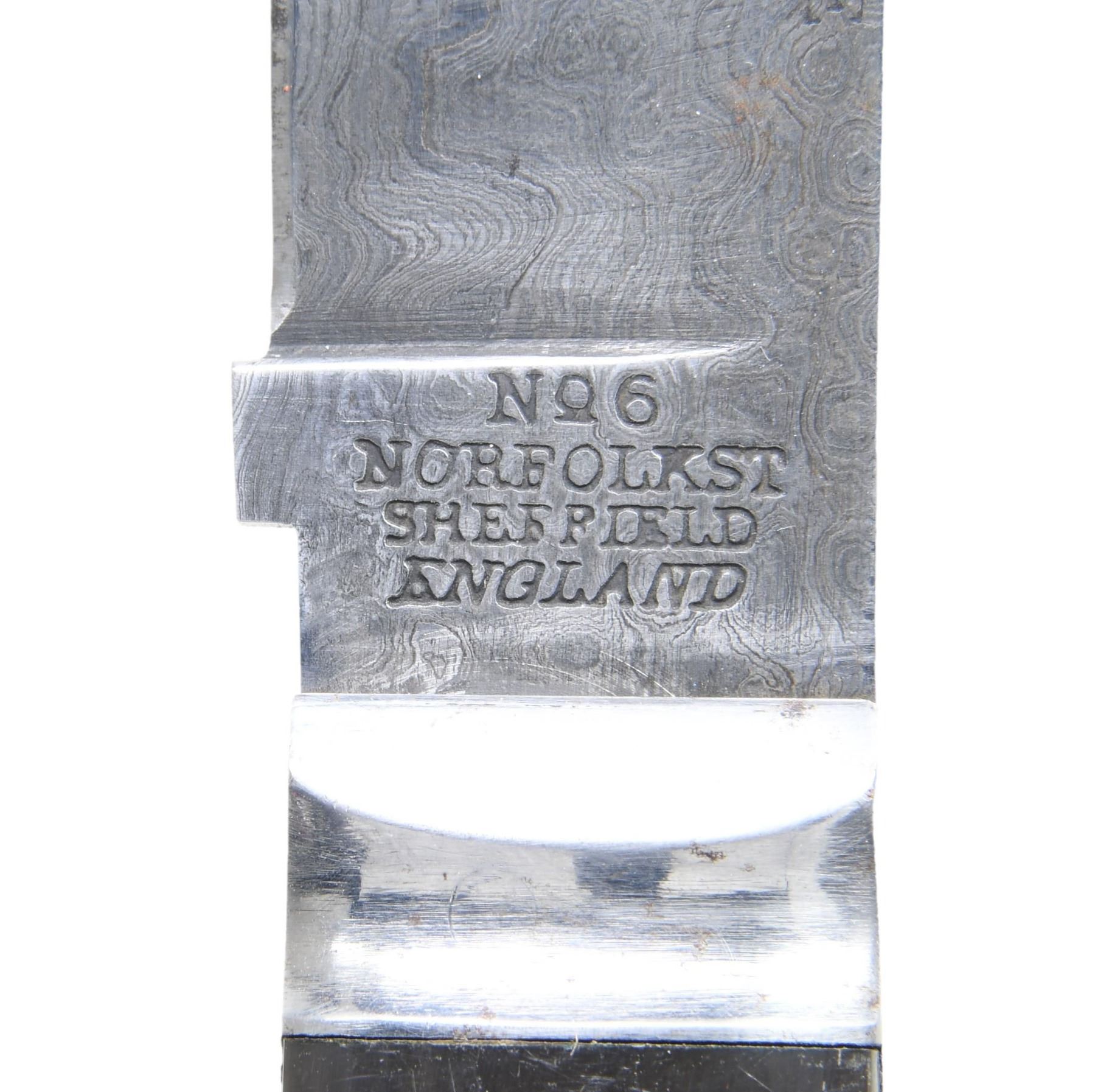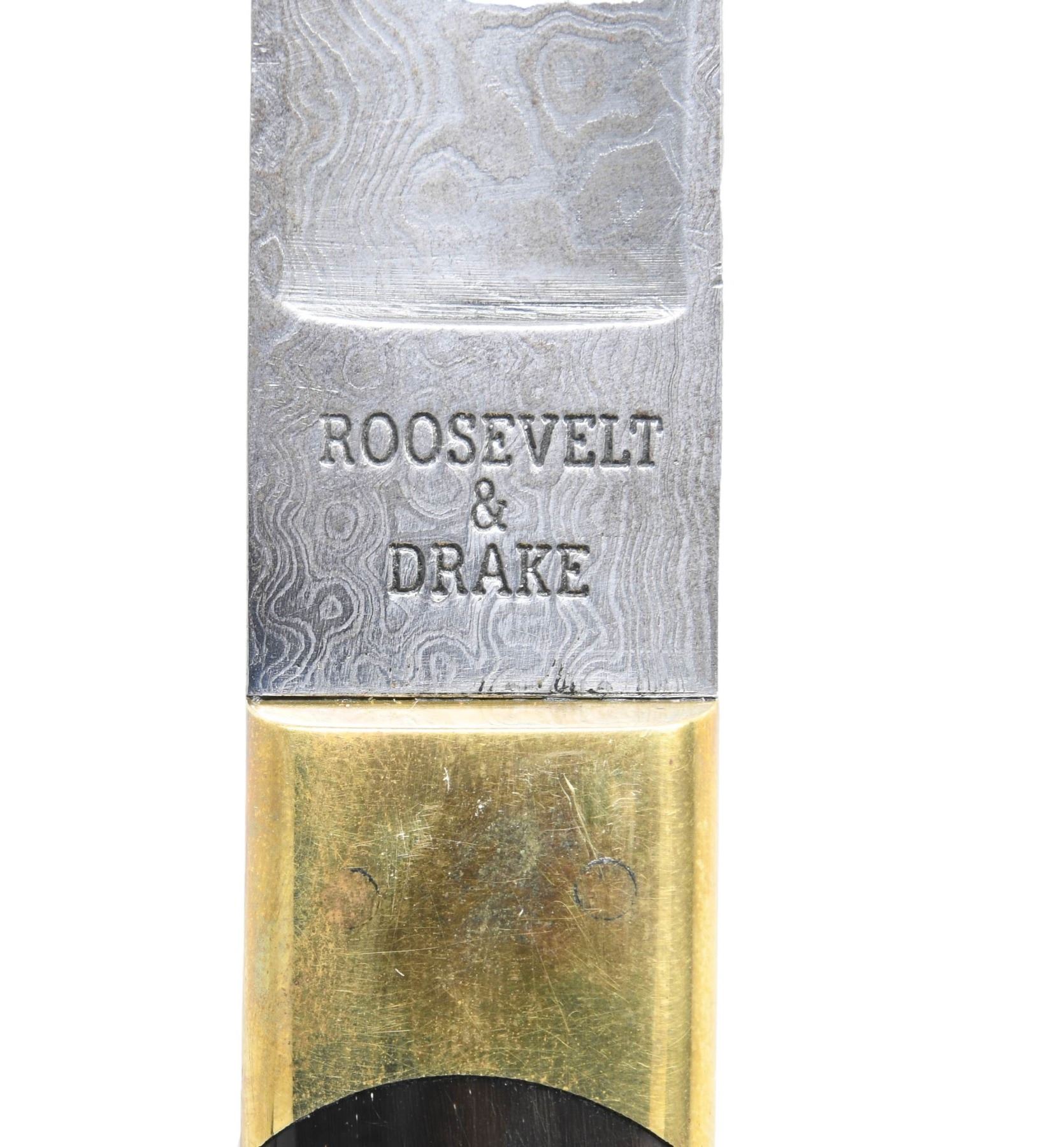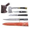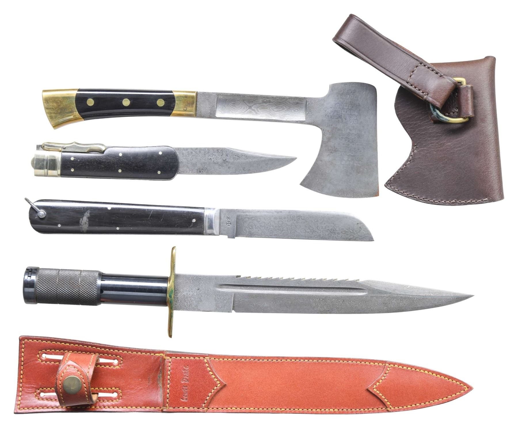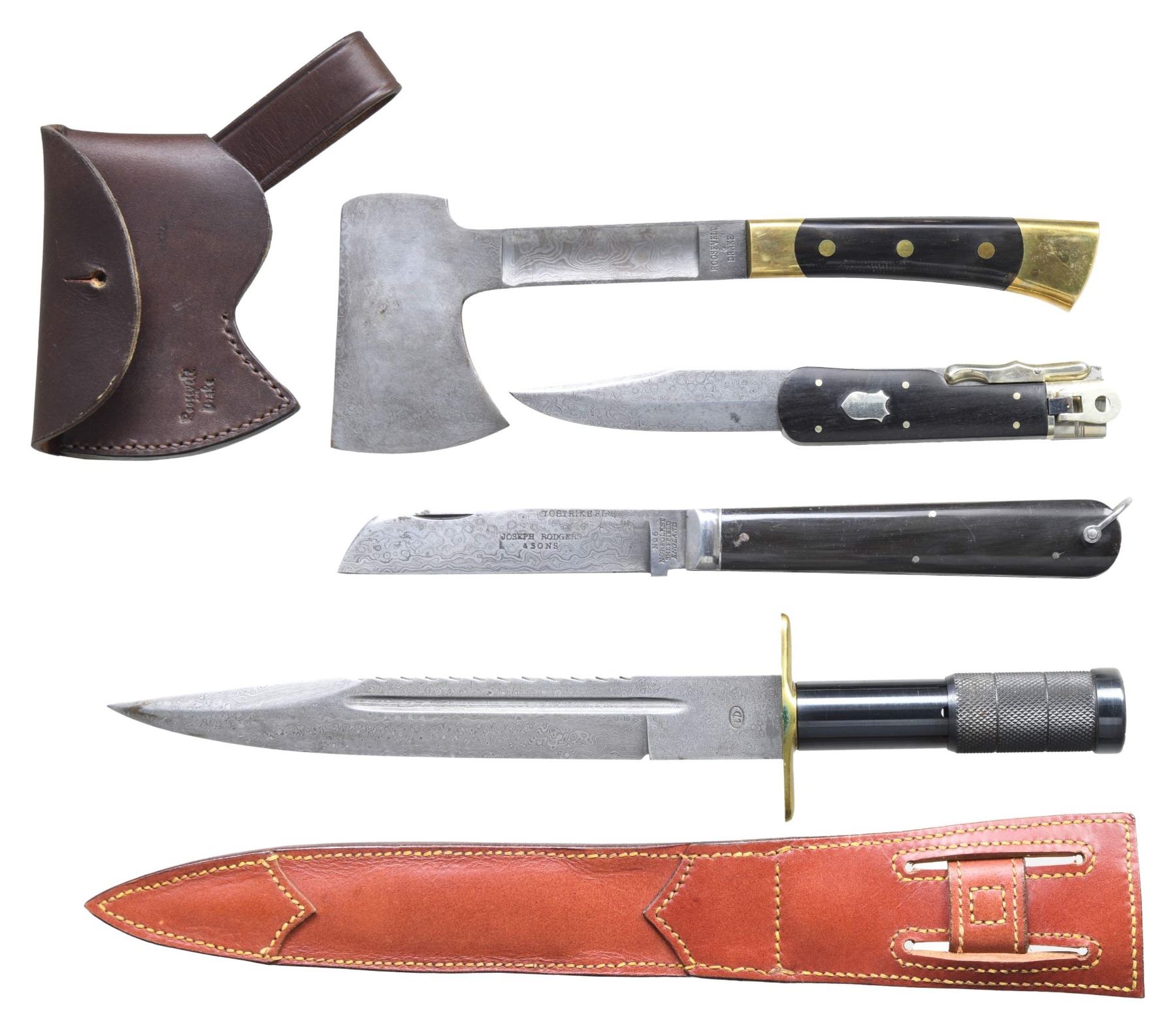 This lot includes 1 reproduction 19th century folding knife measuring 11 1/2" in length with the blade and lanyard ring extended. The blade itself measures 5" in length. The Damascus steel blade is stamped "JOSEPH ROGERS & SONS" on the flat and "No 6 NORFOLK ST SHEFFIELD ENGLAND" at the ricasso. The blade is also stamped near the spine "TO STRIKE FIRE". The buffalo horn grips are secured by 4 pins and a lanyard ring. / 1 Baldock spear knife. Hand forged Damascus steel blade with a sawtooth spine. Brass guard with a blued spring steel handle. This is an exact reproduction of an English survival knife of the late 19 century. The 9 5/8" blade has a hollow handle that facilitates secure mounting on the end of a shaft to form a spear. The leather sheath is embossed near the throat "Lewis Drake". An ingenious design that is just as useful today as when it was introduced in the late 1800's. / 1 reproduction 19th century folding knife measuring 12" overall when extended and featuring a 7 1/4" blade. The Damascus steel blade is stamped "(logo) MENRY KAUFMANY & SONS 1ST GERMAN MANUFACTURE No 55". Buffalo horn grips secured by 6 pins. Has a shield-shaped escutcheon on the front grip. / 1 camp axe of Damascus steel measuring 10 3/4" in length with a head measuring 3 3/4" and a bit measuring 2 1/2". The shaft is stamped at the ricasso "Roosevelt & Drake". The buffalo horn grips have brass ends and pommel with 3 brass rivets to secure each grip. Leather sheath embossed "Roosevelt AND Drake". CONDITION: all edged weapons are like new with very minor storage wear. PROVENANCE: from the renowned collection of quality sporting arms from Lewis Drake together with inventory of Lewis Drake Associates. (02-23565-31/BF). $500-1,000.
