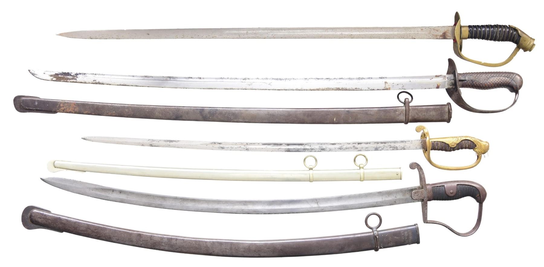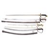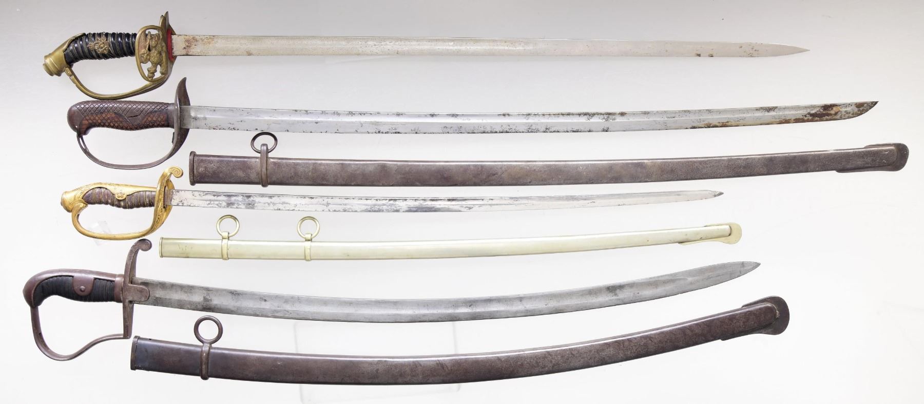 1) JAPANESE CAVALRY. A classic type 32 Japanese Cavalry trooper’s saber measuring 39” overall with a 32 3/4” blade. Blade is stamped at the ricasso “44183”. Iron hilt with a crosshatched wood grip. Original scabbard. Blade has been improperly sharpened, with oxidation at the tip. 2) JAPANESE POLICE. A WWII era Japanese police parade saber measuring 32 3/4" overall with a 26 1/4" blade. Gilded brass hilt with a 5-petal cherry blossom on the backstrap. Original scabbard. 3) IMPERIAL GERMAN. An Imperial German infantry officer’s sword measuring 36 1/4" overall with a 30” blade. Gilded brass hilt with folding guard and cypher on the grip. No scabbard. 4) IMPERIAL GERMAN. An Imperial German artillery saber measuring 36” overall with a 29 3/4" blade. Blade has a single wide fuller and has arsenal marks on the spine. Iron hilt with regimental markings on the crossguard. Leather-covered grip. Iron scabbard with matching marks at the throat. CONDITION: all swords generally show light to moderate wear, except as noted above. (02-22688-3/BF). $600-850.