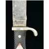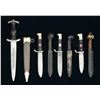 1) HITLER YOUTH KNIFE. Overall length: 10 1/8". Blade is etched “Blut und Ehre!”. Blade marked, “RZM M 7/51 1937”. Plated hilt. 2 Piece black composite checkered grips. Front grip has an inset red, white & black enameled Hitler Youth diamond. Black enameled metal scabbard w/ integral leather frog. CONDITION: blade has been sharpened & shortened. Hilt & grips show light wear. Scabbard shows light to moderate wear. (02-15071/BF). 2) HITLER YOUTH KNIFE. Overall length: 10". Blade marked, “RZM M 7/38”. Plated hilt. 2 Piece black composite checkered grips. Front grip has an inset red, white & black enameled Hitler Youth diamond. Black enameled metal scabbard w/ integral leather frog. CONDITION: blade shows light general wear. Hilt shows light wear but has a few areas of finish loss. Scabbard shows light wear. (02-15074/BF). 3) GERMAN YOUTH KNIFE. Overall length: 10". A post war example of a German youth knife. Blade marked, “SOLINGEN GERMANY” w/ a logo that appears to be a hand grasping 3 arrows. Plated hilt. 2 Piece black composite checkered grips. Front grip has an inset silvered fleur de lis diamond. Black enameled metal scabbard w/ integral leather frog. CONDITION: blade has a medium gray mottled patina. Hilt shows light overall wear. Scabbard shows moderate wear w/ 65% finish remaining. Leather snap strap at the top is detached. (02-15087/BF). 4) SS STYLE DAGGER. Overall length: 14 5/8". This is an assembled dagger that does have some very useful parts. Blade is etched, “Meine Ehre Heist Treue”. The reverse marked, “CARL EICKHORN(squirrel)SOLINGEN”. Nickel silver crossguard & pommel. Carved wooden grip w/ lg. improper inset Party eagle & improper SS enameled button. Scabbard appears to be an anodized brown SA scabbard that has been artificially darkened black. CONDITION: blade shows light wear w/ the exception of light pitting & oxidation on the reverse near the crossguard. Mounts show light wear. Grip is homemade. Scabbard generally shows light wear but has been darkened. (02-15092/BF). $700-1,000.