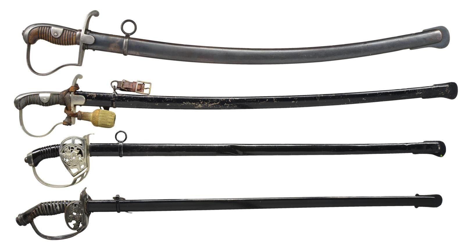4) GERMAN\AUSTRIAN. Overall length 36 1/2". Blade length 29 1/2". A German or Austrian enlisted mounted saber used by cavalry as well as artillery. Plain single fullered blade. Heavy reverse P iron hilt stamped on the cross guard “1.\R.R.6.239” & “1920”. Guard has languets and a downturned quillon. Heavy iron backstrap with ears on both sides. 1 Piece reeded wood grip. Darkened iron scabbard. CONDITION: blade has a medium gray finish with scattered staining. Hilt and scabbard show light wear overall. (02-18151-4/BF). $800-1,200.