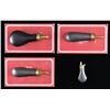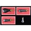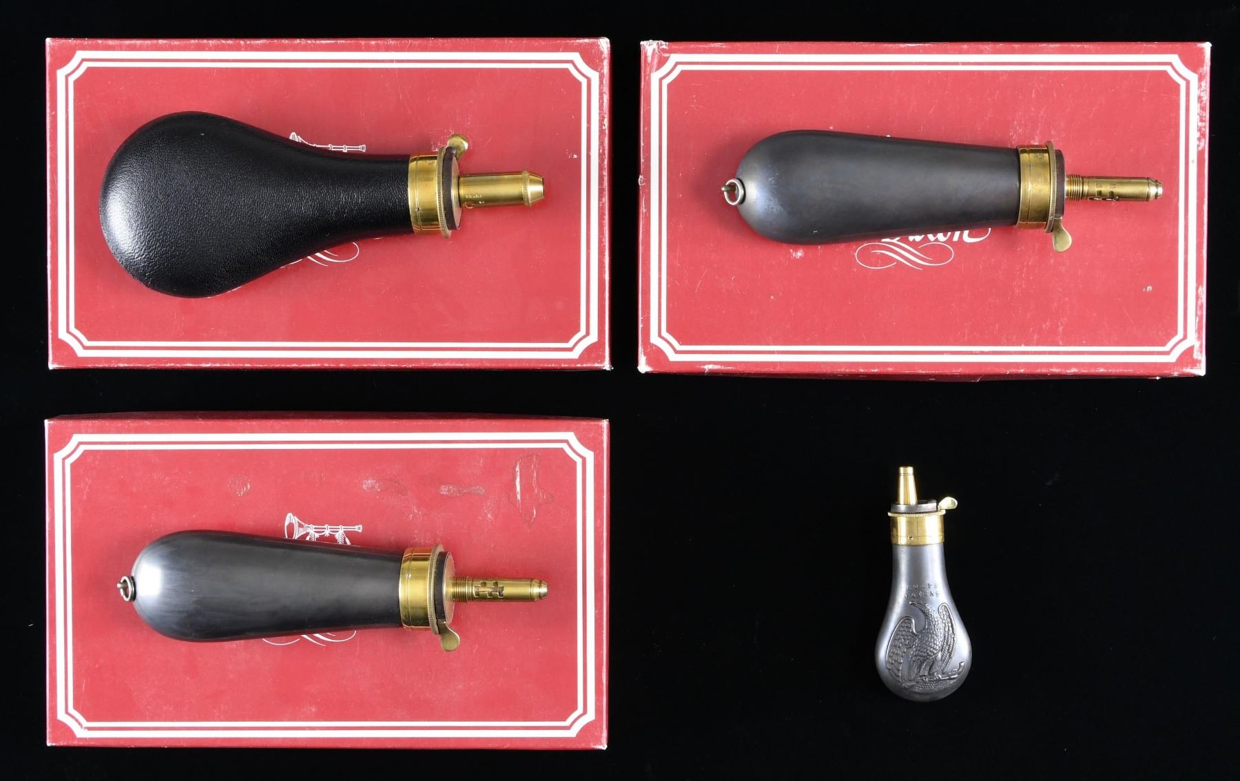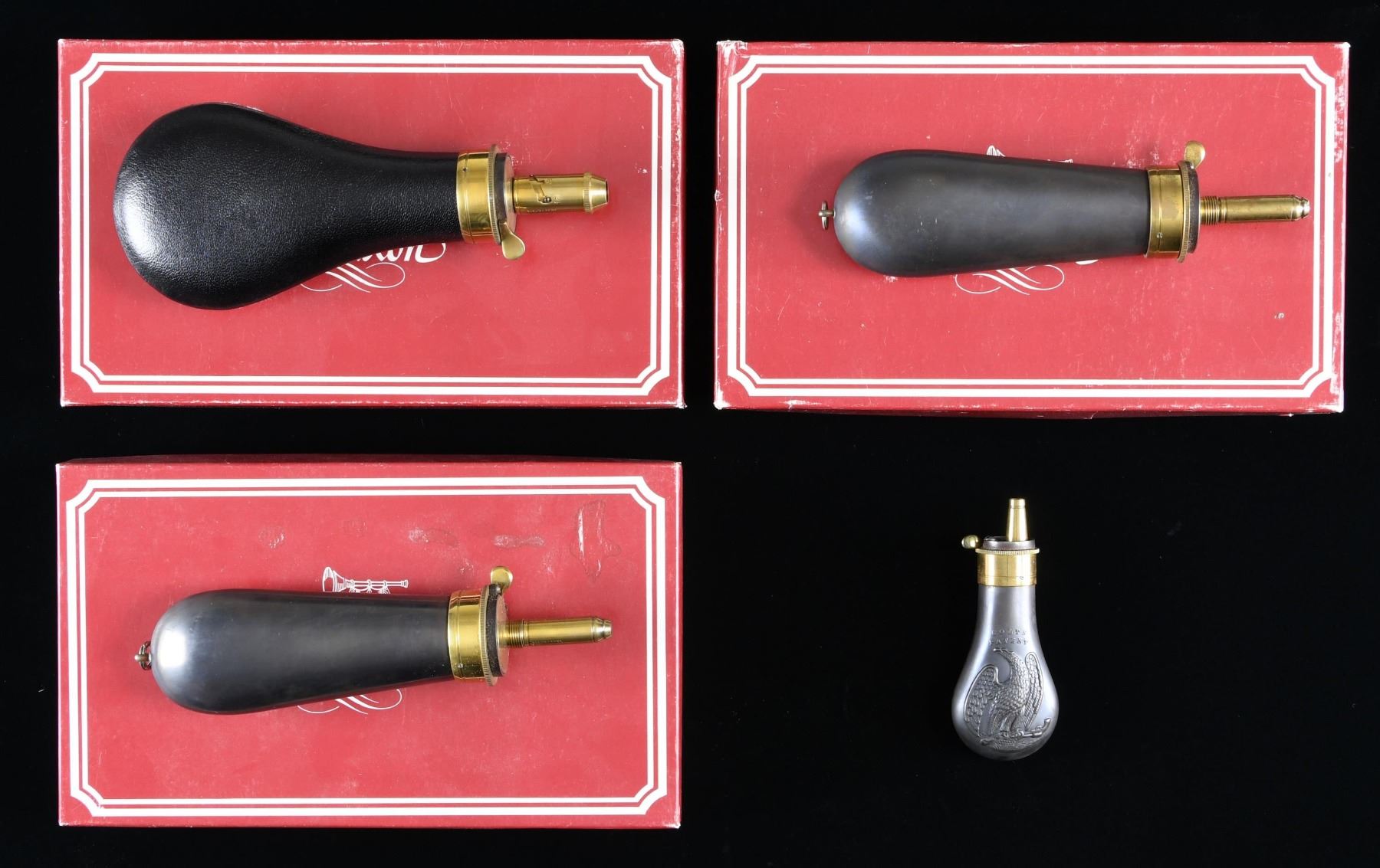 All Mfg. in England; 3 have their own red & white box. 1) Overall: 8.25" with leather covered body. / 2+3) Overall: 8" with ring at bottom of body. / 4) Overall: 4.5" w/out box. CONDITION: all are very good overall with light wear & pinprick patina. PROVENANCE: from the renowned collection of quality sporting arms from Lewis Drake together with inventory of Lewis Drake Associates. (02-23562/MD). $175-275.