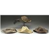 1) A tan felt wide-brim hat with no sweatband or hatband. CONDITION: hat has significant insect damage and discoloration throughout. The hat remains solid though heavily used.