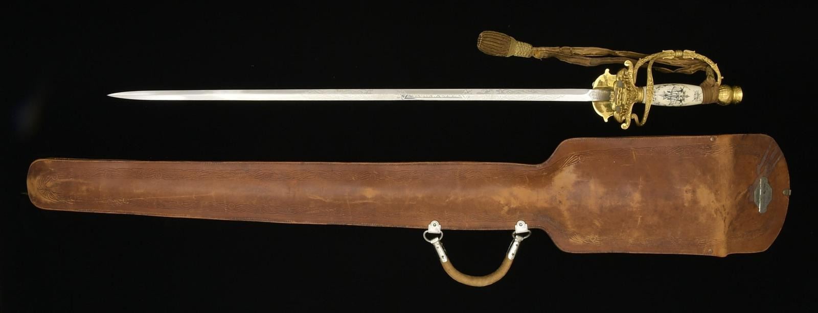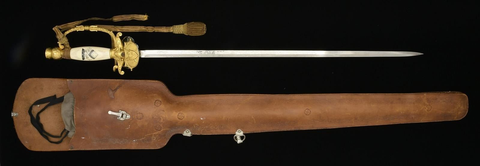 1) INTERNATIONAL ORDER OF ODD FELLOWS SWORD. Overall length: 36 1/2". Blade length: 28 1/4". Blade is etched over half its length w/ various foliate & Odd Fellow motifs including a panel that reads, “Col. Geo. W. Towne.”. Ricasso is etched, “Made by The M.C. Lilley & Co Columbus, O”. Heavily embellished gilded hilt w/ various Odd Fellows motifs including the initials, “PM” w/ crown for Patriarchs Militant. Sword knot attached. Plated iron scabbard w/ heavily gilded mounts. Scabbard is also engraved, “Col. Geo. W. Towne.”. Sword is housed in a cloth bag which is in turn housed in a leather carrier w/ a plaque that reads, “Col George W Towne Lawrence Mass”. CONDITION: sword shows very light wear overall. Sword knot is separated. Cloth bag & leather carrier show light to moderate wear. (02-15373/BF).