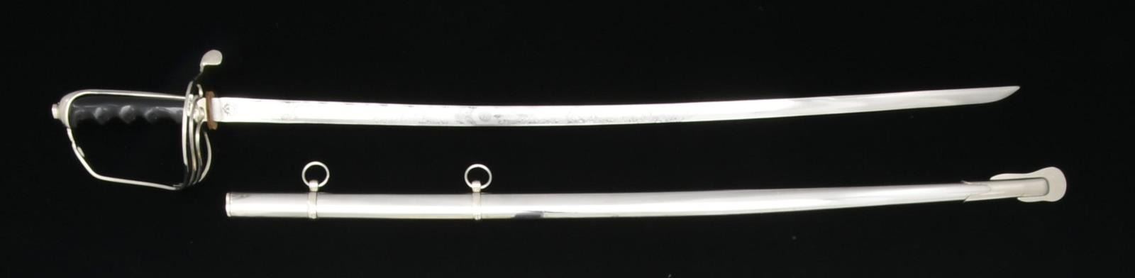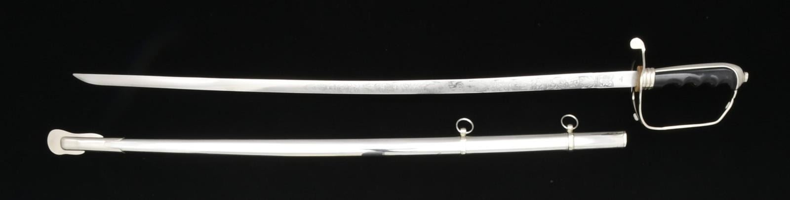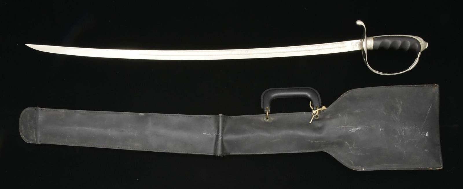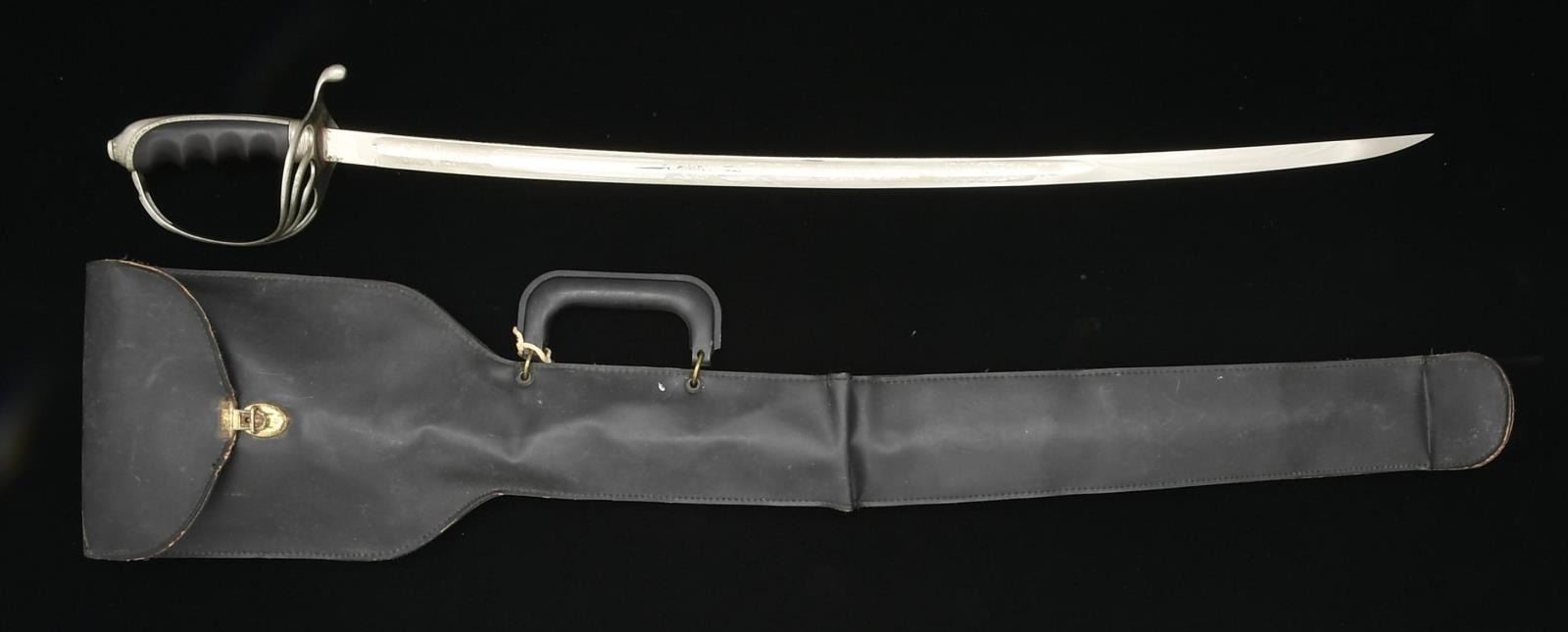 3) US M1902 OFFICERS SABER. Overall length: 36 1/2". Blade length: 29 3/4". Blade is etched over 2/3 of its length w/ various military, foliate & patriotic motifs including a blank panel. Ricasso marked, “THE M. C. LILLEY & CO COLUMBUS, O.”. Plated hilt w/ composite formed grip. Plated scabbard. Sword is housed in a black leather like carrying case. CONDITION: blade shows substantial original factory polish. Hilt shows light wear. Scabbard shows significant wear w/ major losses of plating. (02-15375/BF).