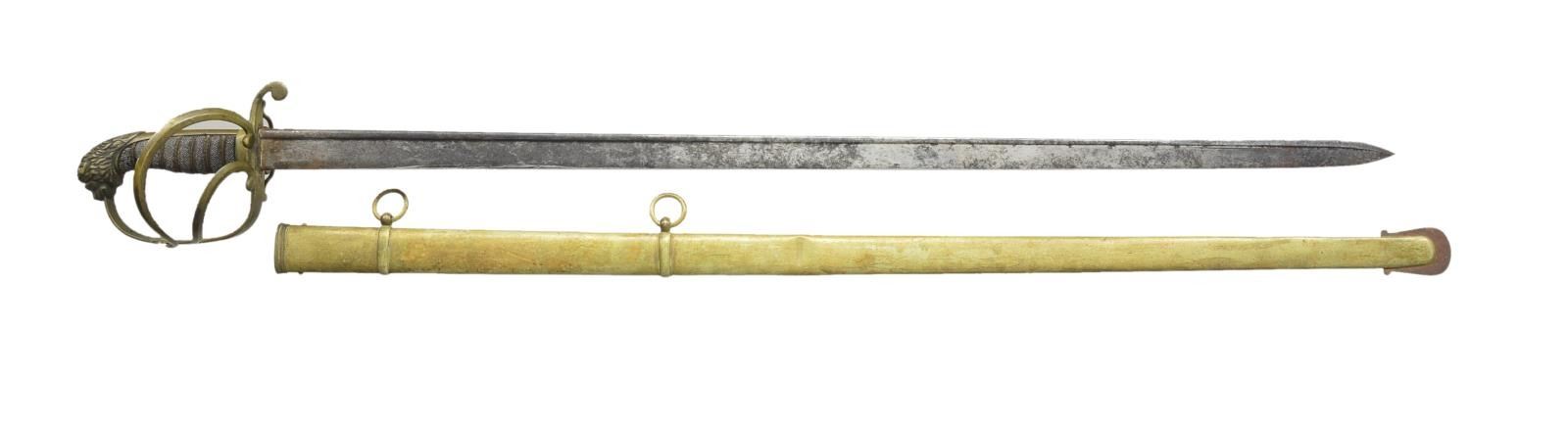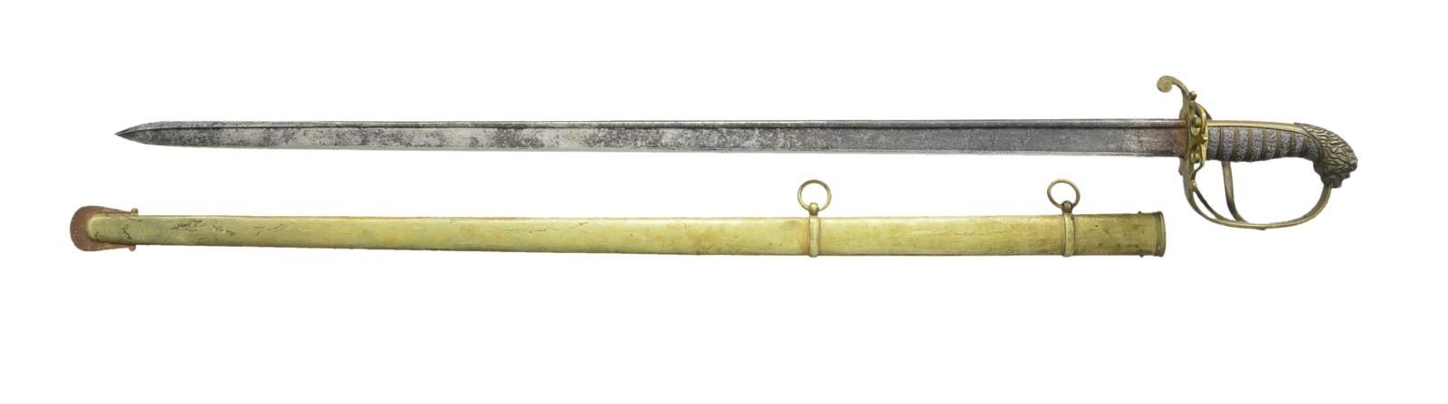 4) BRITISH INFANTRY OFFICERS SWORD. Overall length: 40 1/4". Blade length: 34". Quill back blade etched over half its length w/ various military & patriotic motifs. There is no legible mark observed. Brass branched guard w/ lion head pommel. Wire wrapped sharkskin grip. Scabbard appears to be brass w/ an iron drag. CONDITION: blade has heavy oxidation obscuring the etching & has been vigorously sharpened. The outside branch of the guard is broken at the knuckle bow. Grip is solid. Scabbard has a few shallow dents & needs a good cleaning. (02-15376/BF). $550-950.