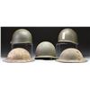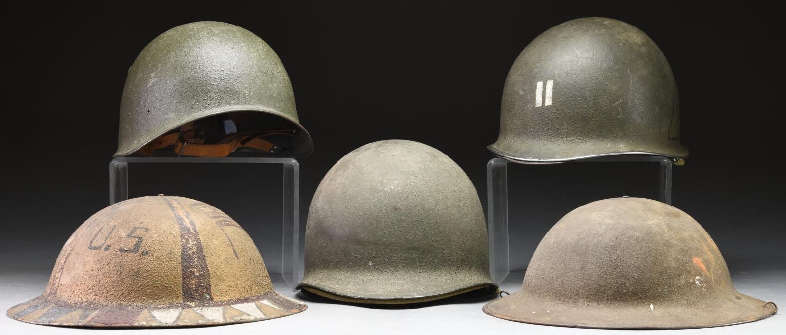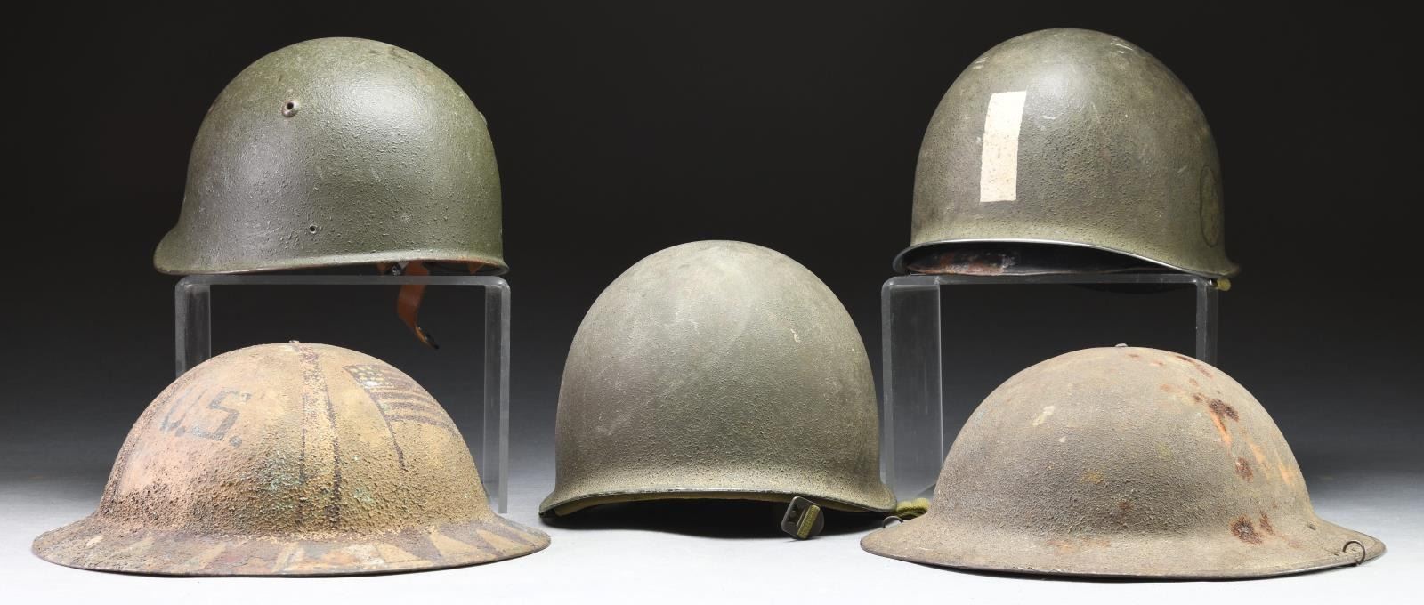 1) WWII US. This front seam, fixed bale WWII M1 helmet has a sanded field green finish and is equipped with a rare Hawley liner. The liner is stenciled on the rear strap “BIECHLIN, E. R. 94299587”. The liner appears complete and there is an OD cotton chinstrap. CONDITION: helmet shows wear but no abuse. The front leather pad in the liner has some flaking but remains complete. 2) WWII US. This front seam, fixed bale WWII M1 helmet has a lightly sanded, dark field green finish. The front of the helmet has 2 white bars, indicating the rank of Captain. There is a large white bar on the reverse. The left side has the outline of a triangle, and the right side has the outline of an egg. No liner, but chinstrap is complete. CONDITION: light to moderate wear overall. 3) FRENCH. An Adrian style helmet in dark blue/gray paint with missing front plate. The liner is brown leather, and there has been a green felt lining added, likely for display. No chinstrap. CONDITION: helmet finish is approx. 70% with some oxidized areas. Liner is quite dry but complete. 4) EUROPEAN. A European helmet that closely resembles Italian helmets of the M1933 style. This helmet has a sanded OD finish with vents on each side of the front. The interior has a brown leather 4-pad liner with a tan leather jump style chinstrap. CONDITION: helmet shows light wear overall. 5) US. An M1917 helmet with a heavily sanded green finish. Painted cloth liner with netting in the crown. No chinstrap. CONDITION: helmet finish is approx. 50% with some oxidation. Liner is stiff but complete. 6) US. An M1917 helmet shell with a heavily sanded finish that has been overpainted in red, white, blue, & gold. There is a dog tooth pattern around the edges, and the crown has been divided into 4 quadrants displaying an American flag in two, and “US” in two. No liner and partial chinstrap. CONDITION: painted finish is quite folky and remains mostly clear. (02-20916/BF). $600-800.