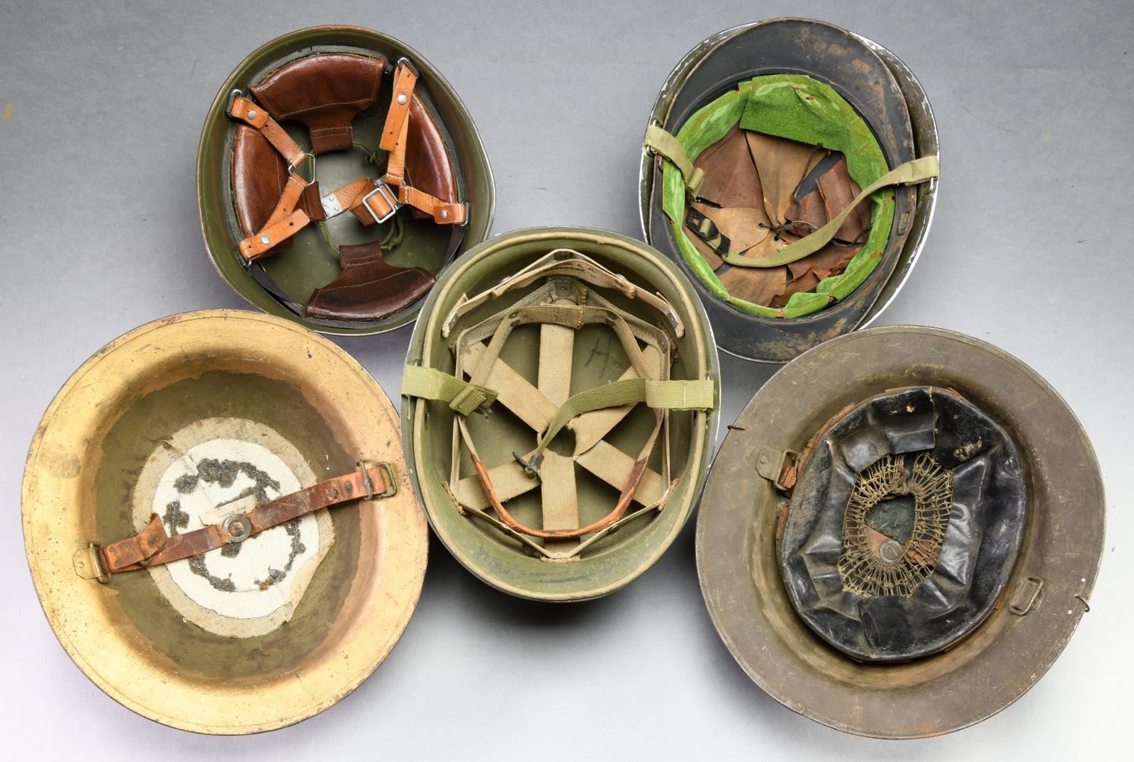 4 US HELMETS, 1 FRENCH HELMET, & A EUROPEAN HELMET