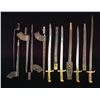 1) Overall length: 30 3/8". Blade length: 25 1/2". A US M1841 saber bayonet w/ a single fullered yataghan blade marked “1861” at the ricasso. Brass hilt stamped, “6858” on the flat. No scabbard. CONDITION: blade has a dark patina. Hilt has a partially cleaned brass finish. 2) Overall length: 26 1/8". Blade length: 21 1/8". A US saber bayonet w/ a single fullered yataghan blade. Solid brass hilt stamped “145” horizontally on the flat. Brass mounted leather scabbard. CONDITION: blade has a light gray patina. Hilt has a mellow patina. Scabbard is missing its tip & both staple pins at the throat. There is an electrical tape repair in the center of the scabbard. 3) Overall length: 25". Blade length: 20". A US saber bayonet w/ a single fullered yataghan blade. Solid brass hilt w/ no stamp on the flat. Brass mounted leather scabbard w/ leather frog. CONDITION: blade has a light gray patina. Hilt has a mellow patina. Scabbard mounts also have a light patina. Scabbard body is solid w/ a few scuffs & scrapes. Frog has moderate wear w/ a break to the retention strap. 4) Overall length: 24 7/8". Blade length: 20". A US saber bayonet w/ a single fullered yataghan blade stamped at the ricasso “B”. Solid brass hilt w/ no stamp on the flat. Hilt is stamped “C” just under the ring. Brass mounted leather scabbard. CONDITION: blade has a medium gray mottled patina. Hilt has a mellow mustard patina. Scabbard mounts have a dark patina w/ areas of verdigris. Scabbard body is solid but flexed & a bit flaked. 5) Overall length: 22 3/8". A M1840 Prussian socket bayonet. Bayonet is housed in a US Civil War period leather scabbard. CONDITION: bayonet has an overall dark patina w/ some pitting near the tip. Scabbard has a badly dented tip & losses to the body & the throat of the scabbard. 6) Overall length: 19". A M1816 US socket bayonet stamped “A / US” at the rear of the flap. Leather scabbard. CONDITION: bayonet has an overall dark patina. Scabbard is reasonably solid w/ scattered flaking & is missing its brass tip. 7) Overall length: 20 3/4". A M1855 US socket bayonet stamped “US” at the throat. Leather scabbard. CONDITION: blade has an overall very dark patina & has a significant bend near the center of the blade. Scabbard is badly shrunk but complete. 8) Overall length: 20 3/4". A M1855 US socket bayonet stamped “US” at the throat. Leather scabbard. CONDITION: blade has a light gray cleaned finish. Scabbard shows significant flaking & has a break just above the tip. (02-14394/BF). $800-1,100.