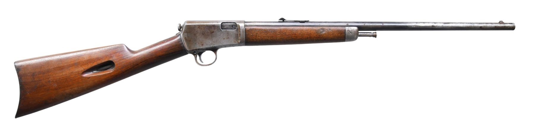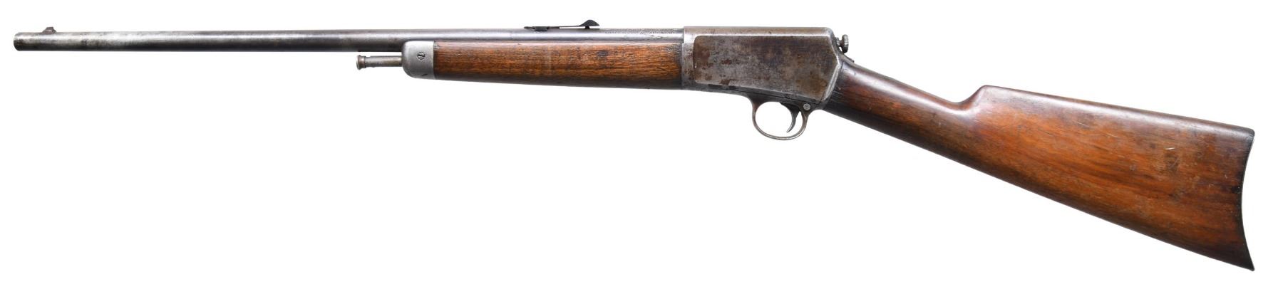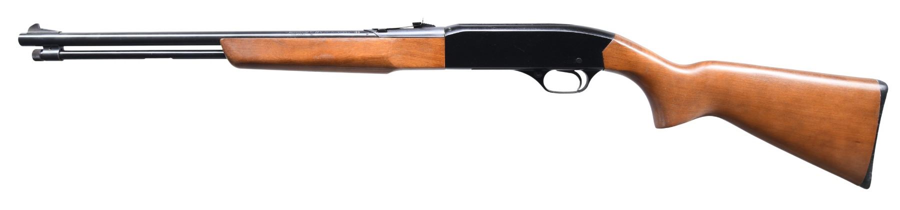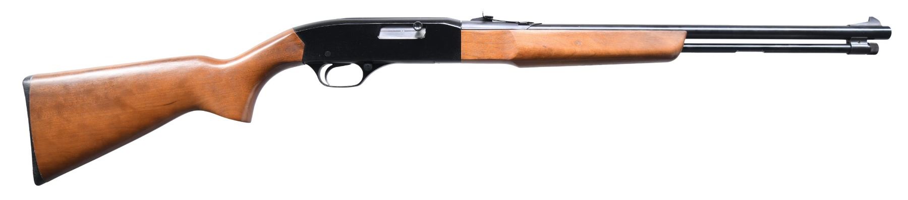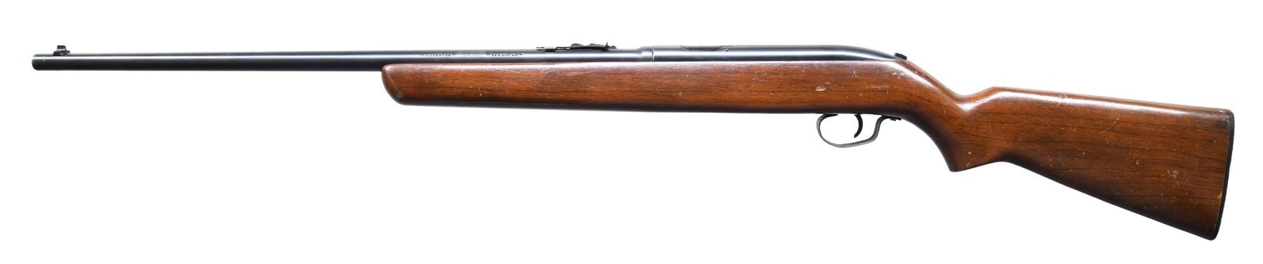 1) MODEL 190. Cal. 22 S, L, LR. S# 345950. Mfg. 1967-1980. Barrel 20.75". Open sights. Tubular mag. Grooved alloy receiver. Hardwood stock set. CONDITION: very good to near excellent wood & metal finish with minute handling marks. Very good bore. (25-682/MD). MODERN. 2) MODEL 74. Cal. 22 LR. S# 78756. Mfg. 1955-1962. Barrel 24". Open sights. Tubular mag. Walnut stock. CONDITION: very good blue. Sanded & refinished wood has fair overall finish. Very good bore. (25-693/MD). CURIO. 3) MODEL 1903. Cal. 22 Win. Auto. S# 56667. Mfg. 1911. Barrel 20". Open sights. Plunger in forearm operates bolt. Tubular mag. Walnut stock set w/ crescent buttplate. CONDITION: metal has dark gray/brown cleaned pitted appearance w/ cold blue applied. Fair worn wood finish with small cracks, deep large gouges & marks. Fair bore with pitting. (25-694/MD). CURIO. 4) MODEL 55. Cal. 22 S, L, LR. NSN. Mfg. 1958-1961. Barrel 22". Open sights. Single shot open bolt action with top loading port & bottom eject. Walnut stock. CONDITION: very good blue. Good wood finish with numerous handling marks. Very good bore with strong rifling. (25-704/MD). CURIO. $600-1200.