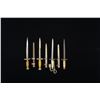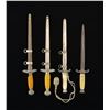 1) LUFTWAFFE. Overall length: 16 3/4". Unmarked blade. Aluminum crossguard & pommel. Wire wrapped yellow composite grip. Plated scabbard. CONDITION: blade shows some areas of factory polish. Mounts show expected wear. Grip has a crack & sm. loss near the ferrule. Wire is complete. Scabbard shows light wear. 2) LUFTWAFFE. Overall length: 17". Blade marked “RICH A. HERDER SOLINGEN”. Aluminum crossguard & pommel. Wire wrapped yellow composite grip. Plated scabbard. CONDITION: blade has spotty water damage & nicks to the edge. Mounts show moderate wear. Hilt is a bit loose. Grip has significant losses at the top & bottom. Scabbard body is very oxidized. 3) ARMY. Overall length: 15 1/2". Unmarked blade. Plated mounts. White grip likely of post war mfg. Plated scabbard. Complete w/ knot. CONDITION: blade shows very light wear. Mounts have tarnish & a bit of oxidation. Grip shows numerous sm. drying cracks. Scabbard has some loss of finish. Knot shows light wear. 4) ARMY. Overall length: 14 1/2". A relic dagger that may be excavated. No scabbard. CONDITION: blade has a dark patina w/ pitting. Mounts are oxidized & pitted. Grip has significant wear & staining. No scabbard. (02-14486/BF). $800-1,200.