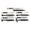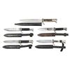 1) WWII German HJ side knife measuring 10 1/4" overall with a plain blade marked "RZM M7/13". Plated hilt with stylized bird's head pommel. 2 piece black cross hatched grips with an inset HJ diamond on the front. Black enameled steel scabbard with leather belt loop. CONDITION: blade shows some sharpening and does not fit in the scabbard well. Hilt shows light wear. Scabbard retains 85% finish and the belt loop is solid. 2) WWII German HJ side knife measuring 10" overall with a plain blade marked "RZM M7/5". Plated hilt with stylized bird's head pommel. 2 piece black cross hatched grips with an inset HJ diamond on the front. Black enameled steel scabbard with leather belt loop. CONDITION: blade shows heavy sharpening and a blunt tip. Hilt shows light wear. Scabbard retains 75% finish and the belt loop is solid. 3) WWII German HJ side knife measuring 10 1/4" overall with a plain blade marked "RZM M7/8". Plated hilt with stylized bird's head pommel. 2 piece black cross hatched grips with an inset HJ diamond on the front. Black enameled steel scabbard with leather belt loop. CONDITION: blade shows light sharpening. Hilt shows moderate wear. Scabbard retains 20% finish and the belt loop is solid. 4) WWII German HJ side knife measuring 10" overall with a plain blade marked "RZM M7/42 1942". Plated hilt with stylized bird's head pommel. 2 piece black cross hatched grips with an inset HJ diamond on the front. Black enameled steel scabbard with plastic belt loop. CONDITION: blade shows no sharpening. Hilt shows nearly no wear but the back grip is missing. Scabbard retains 98% finish and the belt loop is very solid. 5) WWII German dress bayont measuring 13 3/4" overall with a plain single fullered blade marked "(tiger logo)" and "TIGER SOLINGEN". Plated hilt with bird's head effigy pommel and 2-piece stag grips. Black enameled iron scabbard. CONDITION: light wear overall. (02-26154/BF). NON-GUN. $1,000-1,400.