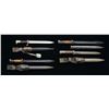 4) WKC DRESS BAYONET. Overall: 14 3/4". Blade 9 3/4" w/ knight bust & "WKC" logo. Nickel plated. 2 Piece black composite grips. Black painted scabbard. Brown leather frog. Silver & green knot on blue colored leather strap. CONDITION: very good bayonet. Good scabbard & frog. (02-16395-5/MD). $300-500.