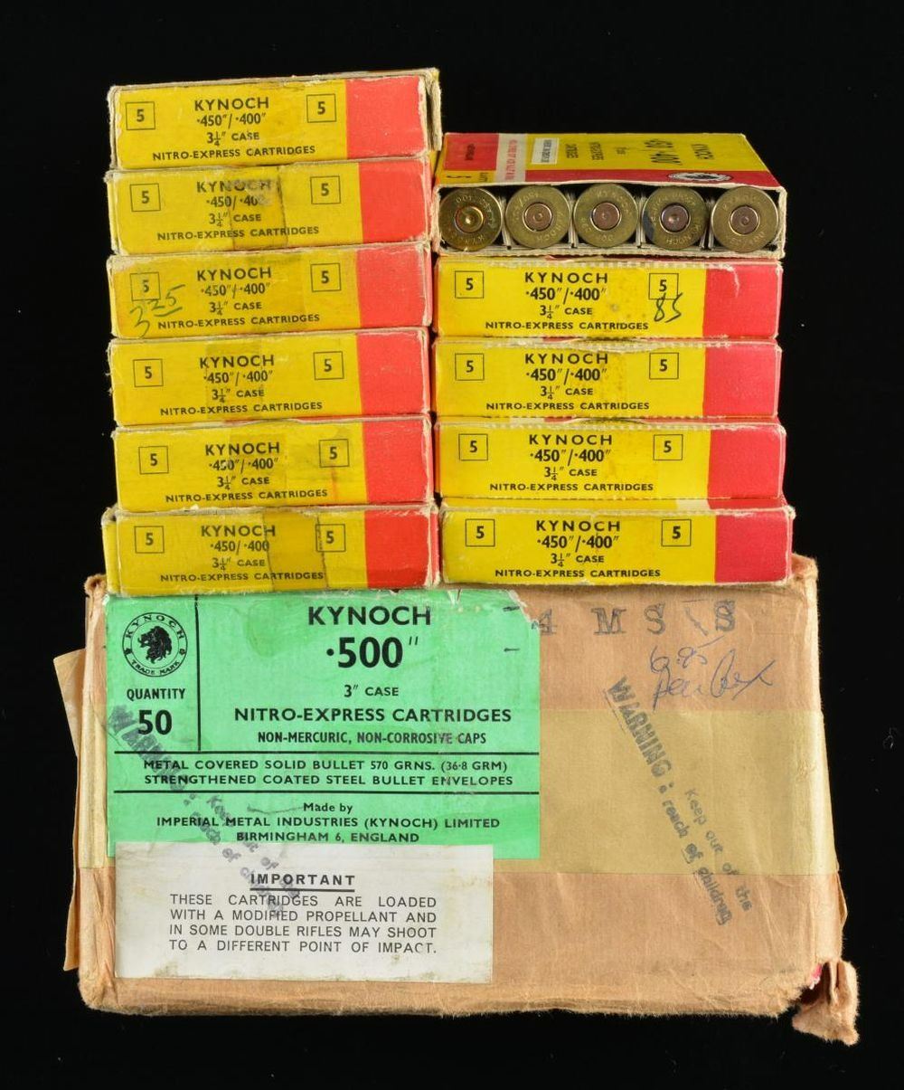 450/400 NITRO EXPRESS: 25 RDS. (5 BOXES) OF KYNOCH 3 1/4" case, 400 gr. soft nose. / 10 RDS. (2 BOXES) OF KYNOCH 3 1/4" case, 400 gr. solid nose / 5 RDS (1 BOX) of mixed ammo. / 2 Empty boxes. 500 NITRO EXPRESS: 50 RDS. (1 SEALED CASE OF 10 BOXES) Nynoch 570 gr. solid bullet. CONDITION: visible boxes are in good to very good condition. 450 Ammo is good to very good, with spots of oxidation, but appears serviceable. Sealed 500 NE case as is. (02-16773-4/MD). $450-875.