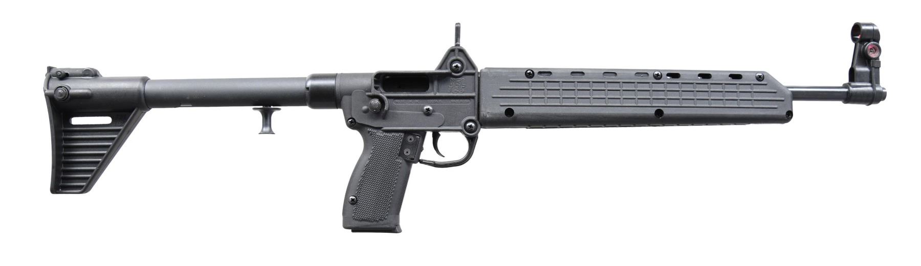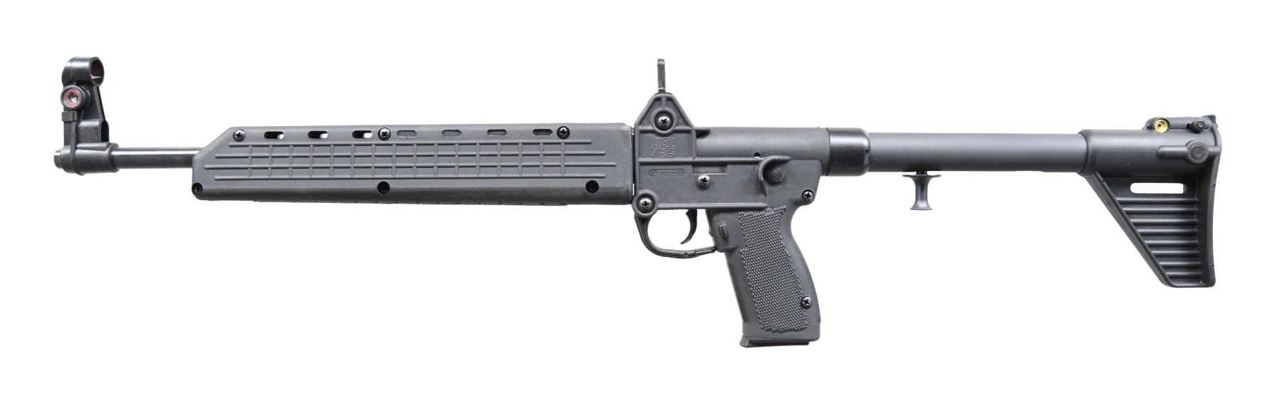 Cal. 40 S&W. S#. EN016. Bbl. 16 1/4". An early offering in the incredibly popular pistol caliber carbine class. Chambered in 40 S&W w/ an interesting folding design allows compact storage & carry w/o the ire of the typical anti-gun politician since it's not a folding stock but a folding bbl. An extremely intelligent design utilizing the common S&W feeding device rather than an expensive proprietary magazine. Black plastic furniture & matching matte black finish on all exposed metal surfaces. Protected high-vis blade front sight & rear peep sight. Simple blowback design w/ charging handle rear of pistol grip in stock tube. MAGS: 1 steel 11 rd. UNATTACHED ACCESSORIES: factory cardboard shipping box & owner's manual. CONDITION: all outward aspects appear that this firearm has been utilized very little if any at all. No noticeable wear or blemishing. Bright bore w/ strong rifling. Fire control mechanism appears to function correctly when cycled by hand. PROVENANCE: Lifelong Collection of Bill Peterken. (24-6281/JZ). MODERN. $200-300.