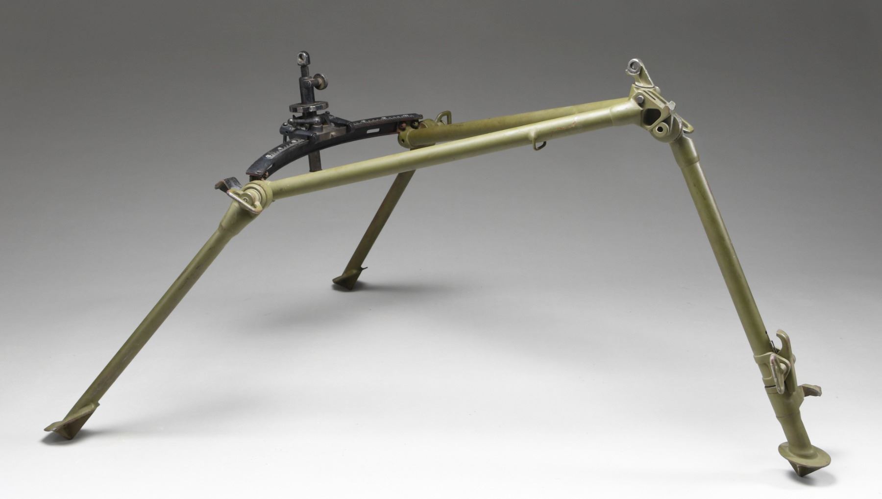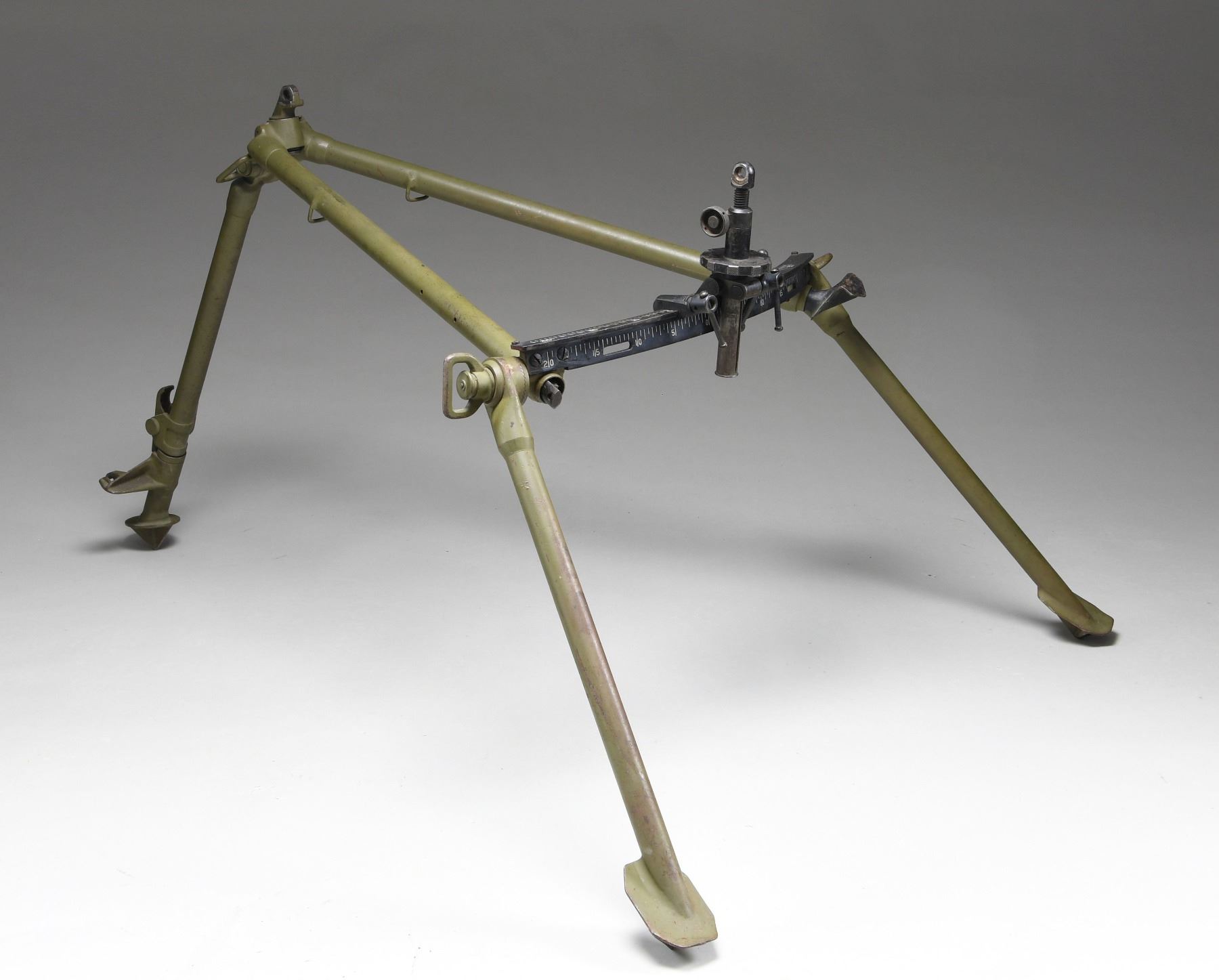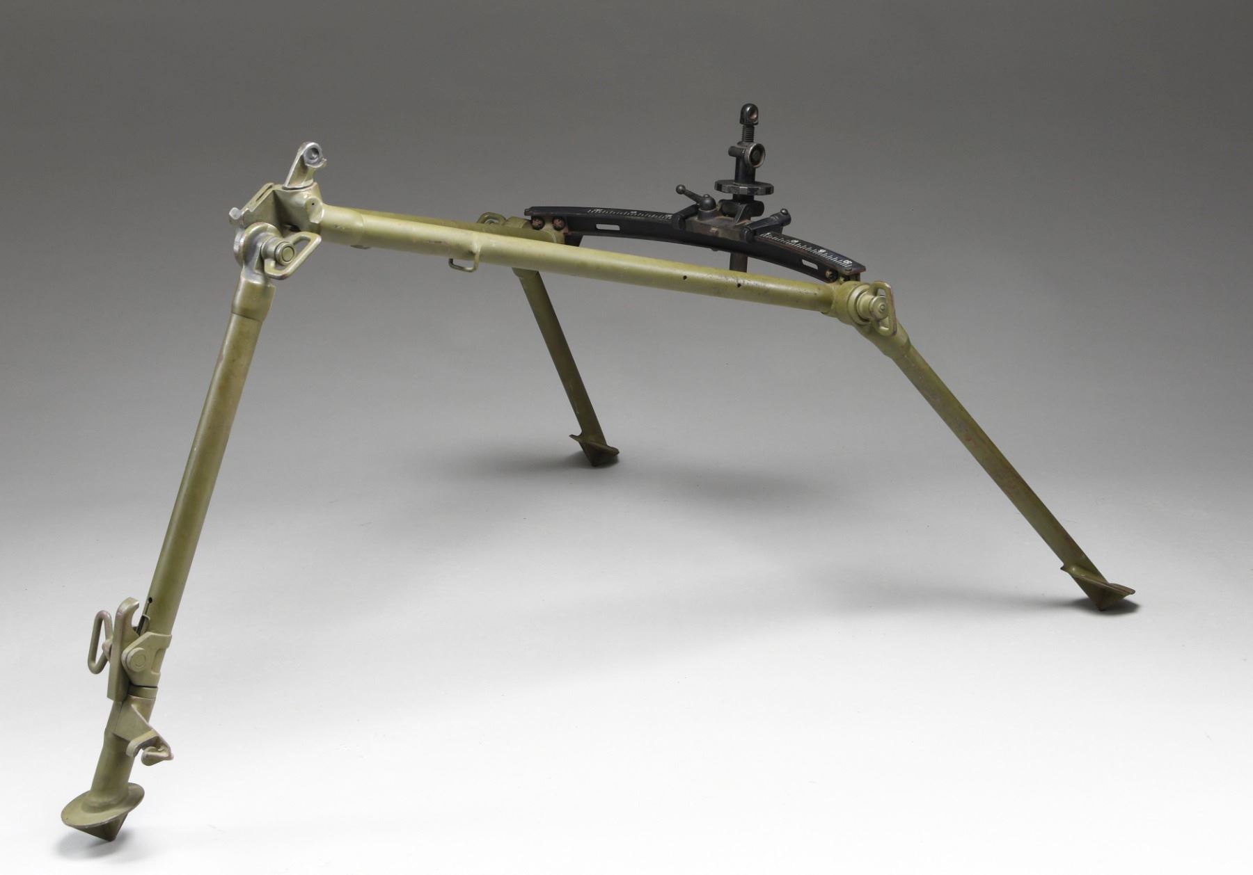 Weight approx. 30 lbs. Tripod extends to approx. 63" in length. Assembly includes pintle, 2 traverse stops & elevation gear assembly. Green painted with S# "A.951" stamped by pintle. CONDITION: tripod appears good overall with wear & oxidation. PROVENANCE: From the Lifelong Collection of Brian Linde. (02-23926-9/MD). $300-600.