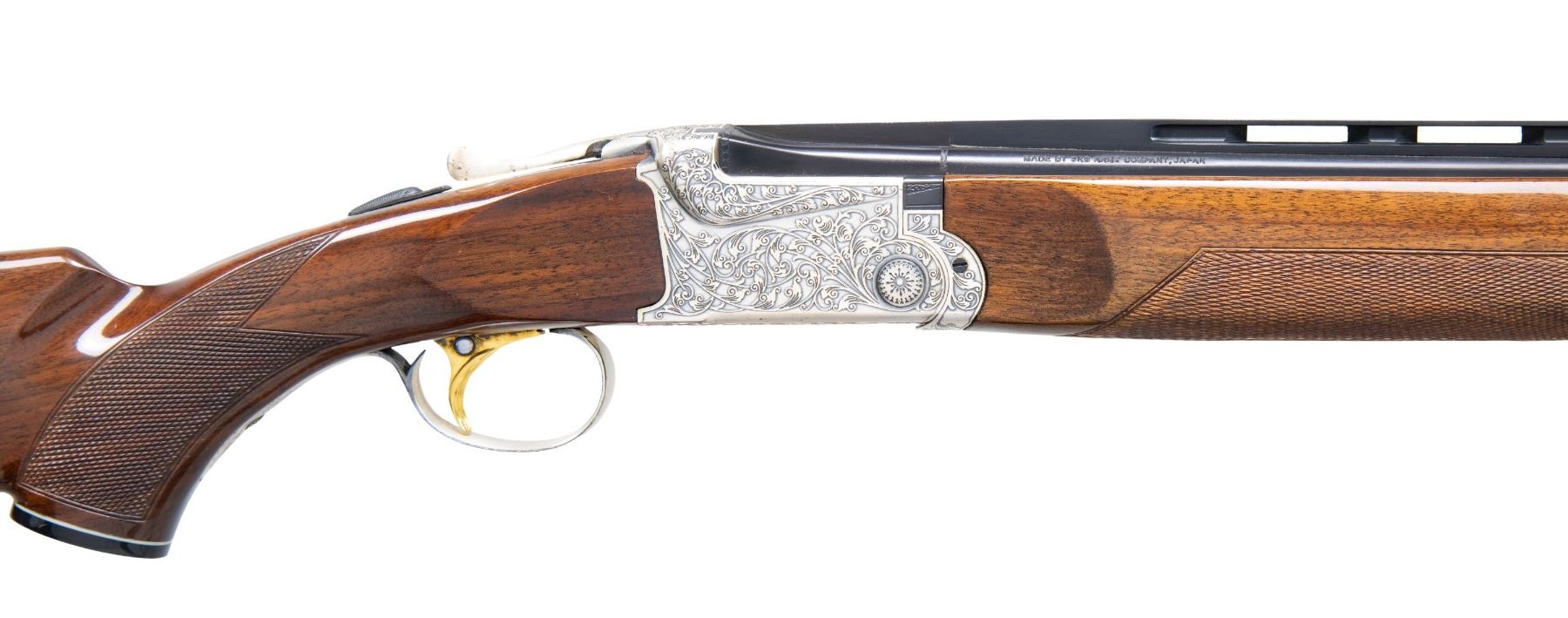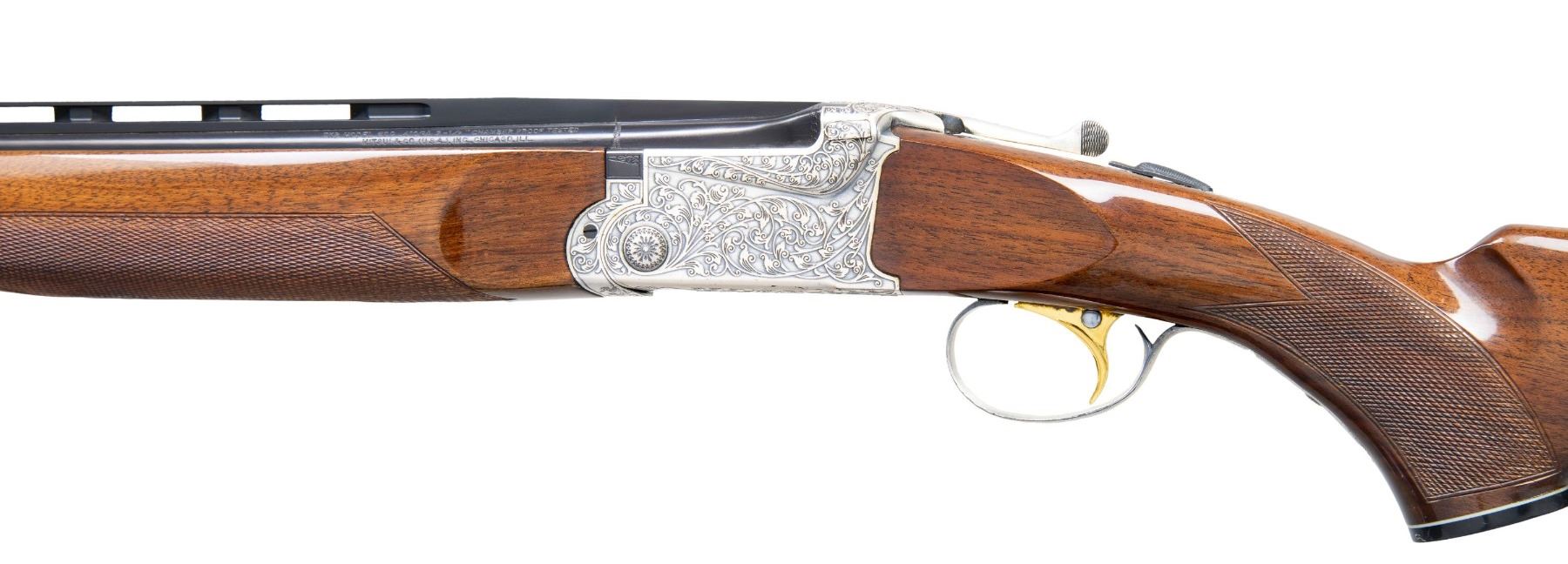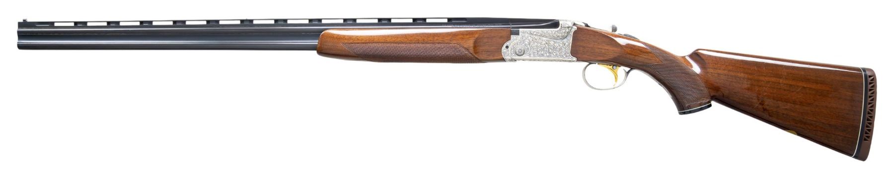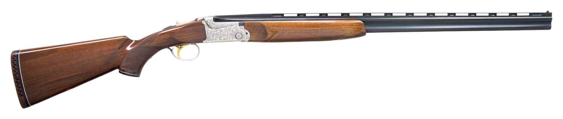 Cal. 410, 2 1/2". S# S6613509. VR 28" bbls. w/ white bead front sight; Marked "SKT" chokes. Silver plated scroll engraved frame with SST & ejectors. Checkered stock set w/ Trap dimension buttstock, gold toeline nameplate & Brown pad. CONDITION: very good overall appearance with light handling marks, wear to carry areas & patina & worn finish to triggerguard. Shiny bore with light fouling. Crossbolt doesn't sit flush with frame when locked up. PROVENANCE: The Esteemed Norm Greenberg Collection. (25-4232/MD). MODERN. $800-1,200.