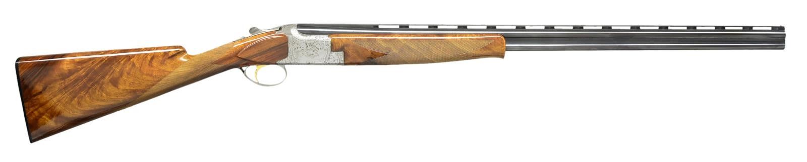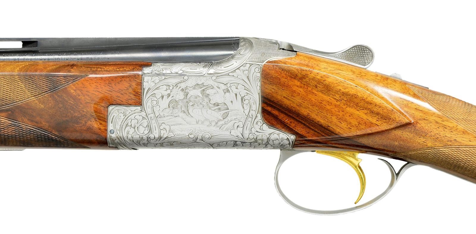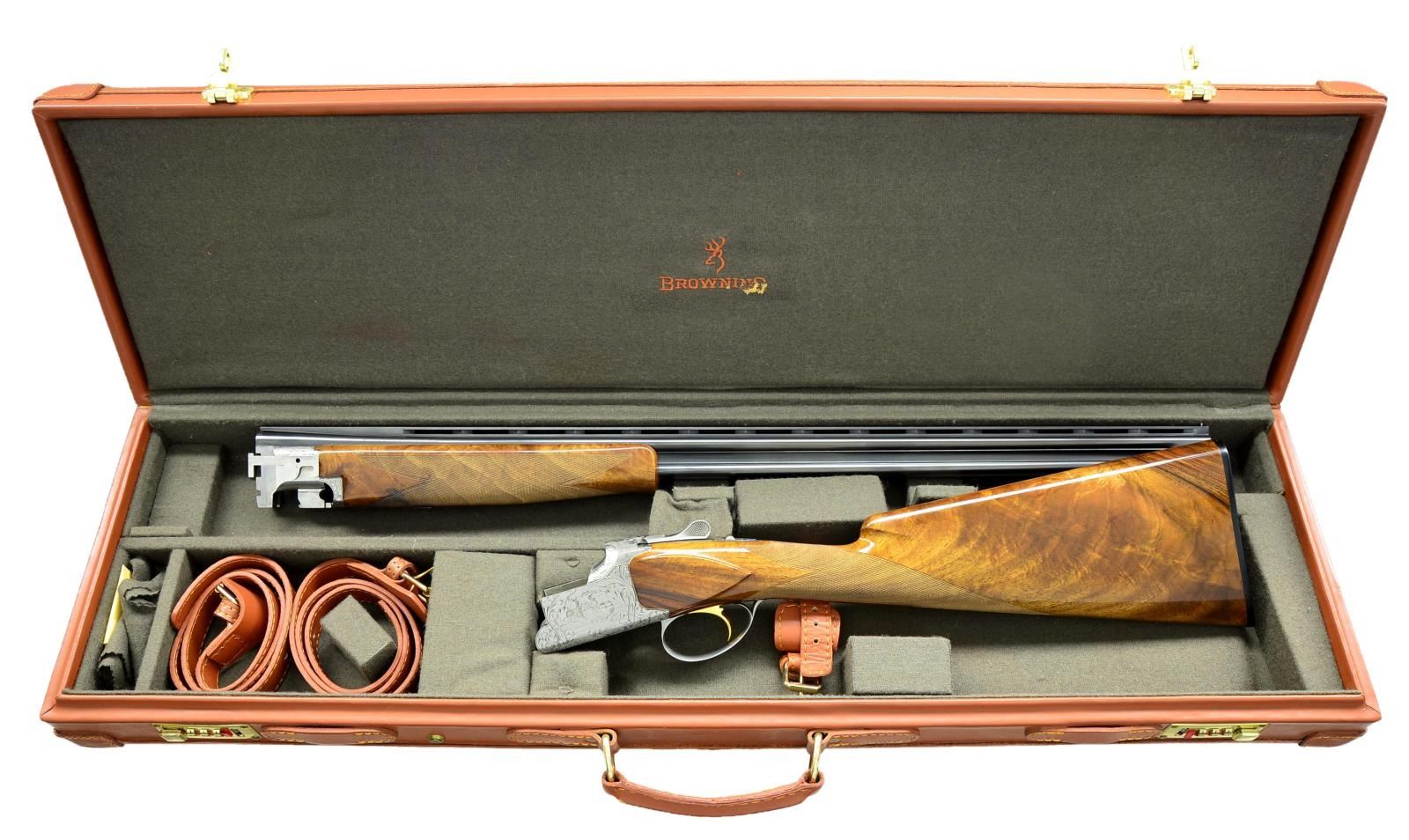 GRADE O/U SHOTGUN ENGRAVED BY DiFRANCO. Cal. 410. S# 534J83. This 1983 production gun has 28" bbls. w/ narrow matted ventilated rib. Top bbl. marked w/ Browning Morgan, Utah & Montreal addresses, steel, caliber, information & "MADE IN BELGIUM BY FABRIQUE NATIONALE HERSTAL". Left side of breech marked for modified & full chokes. Coin finished Superlight action w/ gold plated single selective trigger engraved in Browning Diana style w/ near full coverage, lg. shaded acanthus scroll surrounding game scenes w/ a nye of 5 pheasant on left side & 4 ducks in Marsh on right. 2 Quail fly across bottom of action & a pair of rabbits are on trigger guard bow. This fine engraving is signed "M. DiFranco" under pheasant scene. Crotch figured European walnut straight grip buttstock measures 14 3/8" over Browning hard rubber buttplate. Modified point pattern checkering wraps over top of grip. 1 Piece schnabeled Superlight forend matches well. BORE DIAMETER. AT MUZZLES: bottom .395(mod?), top .380(full?). DAC: 1 7/16". DAH: 2 1/8". WEIGHT: 6 lbs., 11 oz. UNATTACHED ACCESSORIES: housed in brown leather case w/ tag on top embossed "SPORTING" "CLASSIC". Interior is lined in gray cloth & has Browning trademark embroidered in lid. Case contains straps & key. CONDITION: exceptionally fine. Very close to as new, appears to be unfired since proof w/ only 1 or 2 minor assembly & handling marks & all fine factory finishes. Most notably a couple of sm. compressions on right side comb. Case is fine. There is some discoloration to cloth & embroidered word at end of "BROWNING". (21-3927/MGM). MODERN. $18,000-20,000.