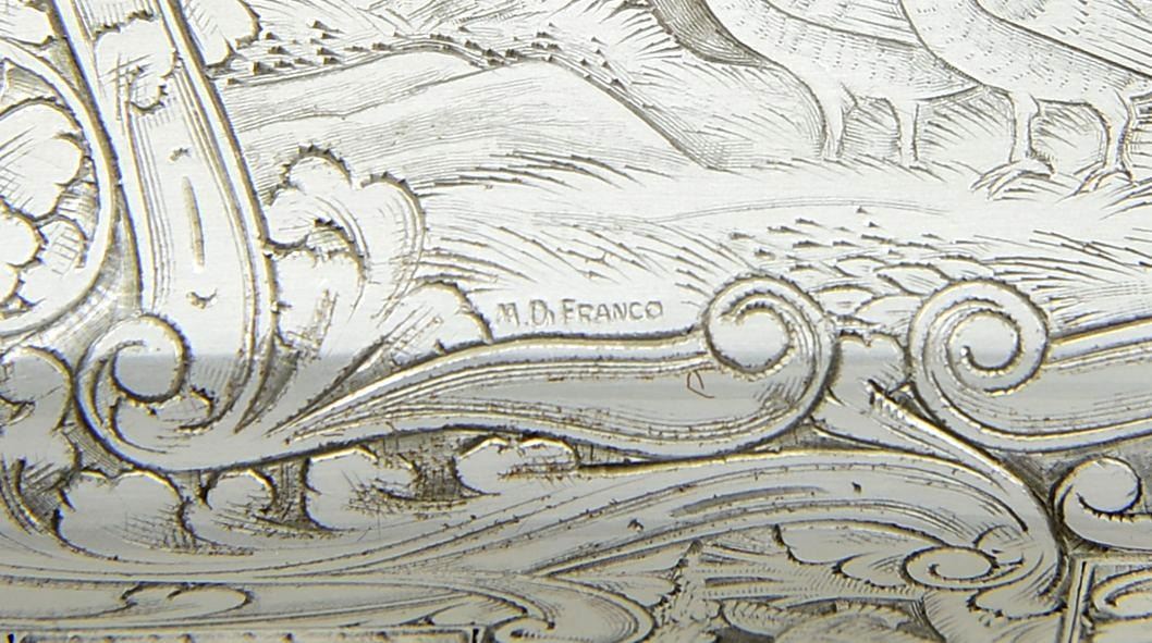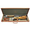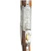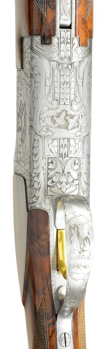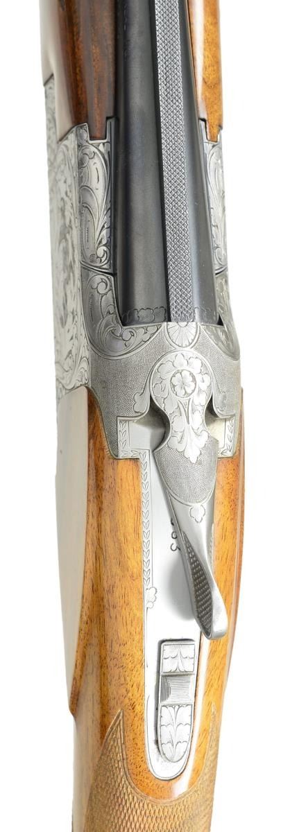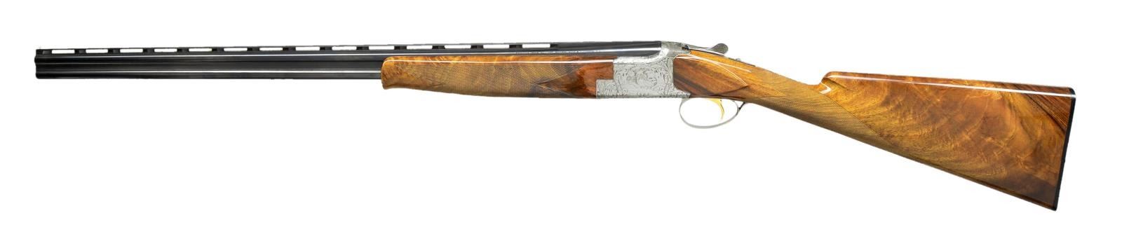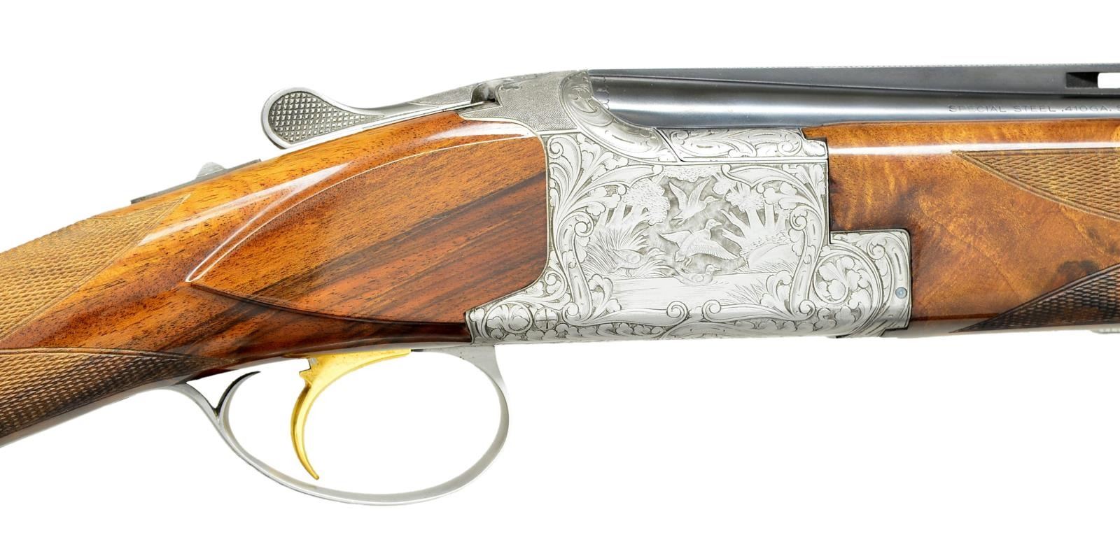GRADE O/U SHOTGUN ENGRAVED BY DiFRANCO. Cal. 410. S# 534J83. This 1983 production gun has 28" bbls. w/ narrow matted ventilated rib. Top bbl. marked w/ Browning Morgan, Utah & Montreal addresses, steel, caliber, information & "MADE IN BELGIUM BY FABRIQUE NATIONALE HERSTAL". Left side of breech marked for modified & full chokes. Coin finished Superlight action w/ gold plated single selective trigger engraved in Browning Diana style w/ near full coverage, lg. shaded acanthus scroll surrounding game scenes w/ a nye of 5 pheasant on left side & 4 ducks in Marsh on right. 2 Quail fly across bottom of action & a pair of rabbits are on trigger guard bow. This fine engraving is signed "M. DiFranco" under pheasant scene. Crotch figured European walnut straight grip buttstock measures 14 3/8" over Browning hard rubber buttplate. Modified point pattern checkering wraps over top of grip. 1 Piece schnabeled Superlight forend matches well. BORE DIAMETER. AT MUZZLES: bottom .395(mod?), top .380(full?). DAC: 1 7/16". DAH: 2 1/8". WEIGHT: 6 lbs., 11 oz. UNATTACHED ACCESSORIES: housed in brown leather case w/ tag on top embossed "SPORTING" "CLASSIC". Interior is lined in gray cloth & has Browning trademark embroidered in lid. Case contains straps & key. CONDITION: exceptionally fine. Very close to as new, appears to be unfired since proof w/ only 1 or 2 minor assembly & handling marks & all fine factory finishes. Most notably a couple of sm. compressions on right side comb. Case is fine. There is some discoloration to cloth & embroidered word at end of "BROWNING". (21-3927/MGM). MODERN. $18,000-20,000.