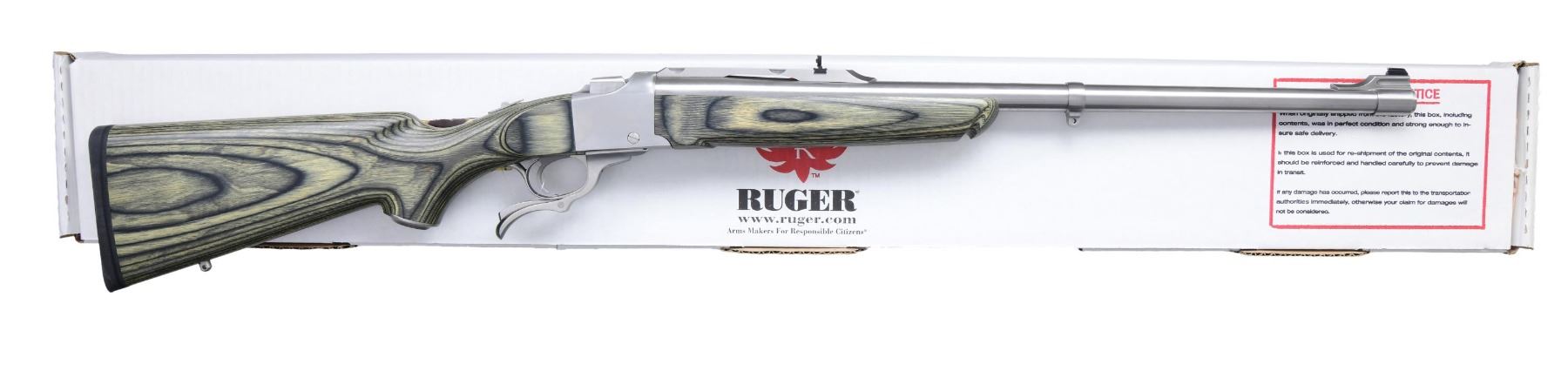 SHOT RIFLE WITH MATCHING FACTORY BOX. Cal. 416 Ruger. S# 134-27731. Mfg. 2009 as Model 11339 / Catalog No. K1-H-BBZ. The rifle features a 24-inch stainless steel barrel, equipped with a bead front sight and a flip-up rear sight on a quarter rib. The frame has a stainless steel finish and utilizes a falling block action. The rifle is configured with a smooth laminate Alex Henry forearm and a smooth laminate pistol grip buttstock, which includes a black rubber pad. UNATTACHED ACCESSORIES: factory box with packaging. CONDITION: overall excellent condition with nearly all of the original stainless steel finish remaining. The forearm and buttstock show minimal wear, retaining a smooth finish. The bore is bright with strong rifling. (24-3682/MD). MODERN. $700-1,000.