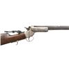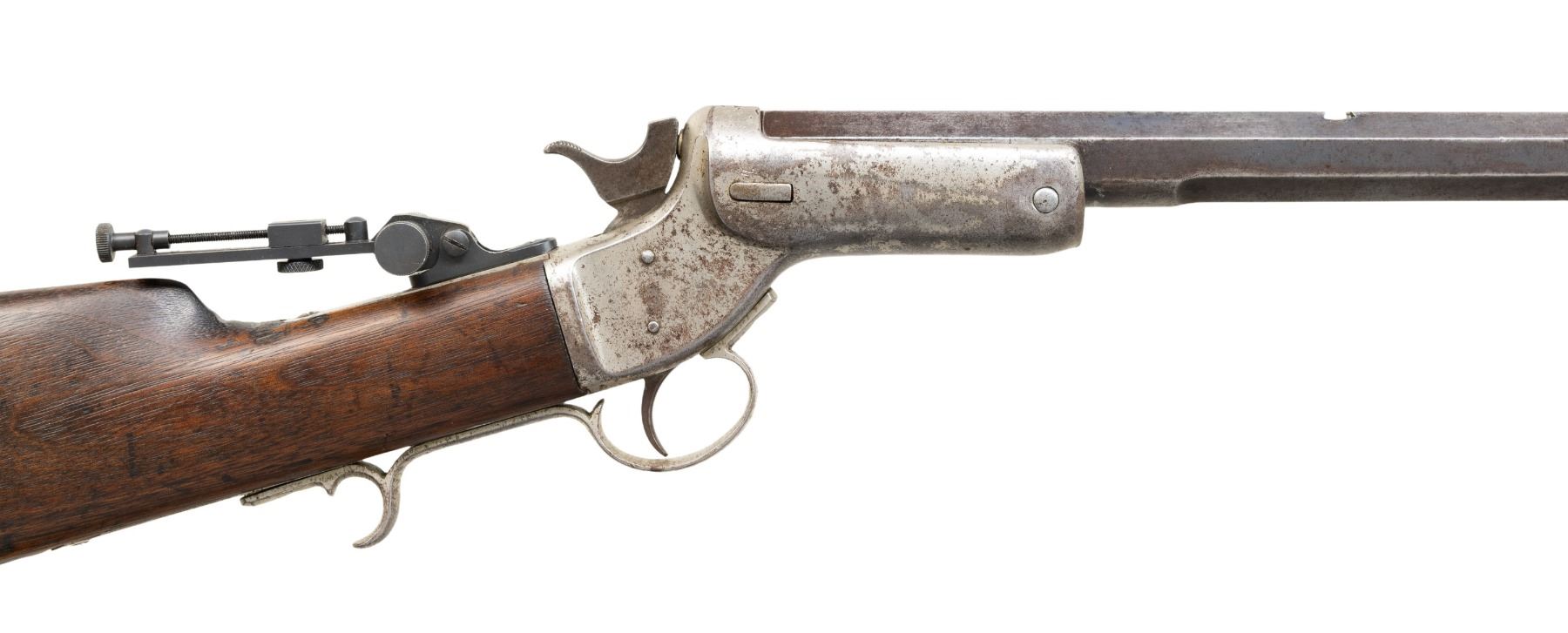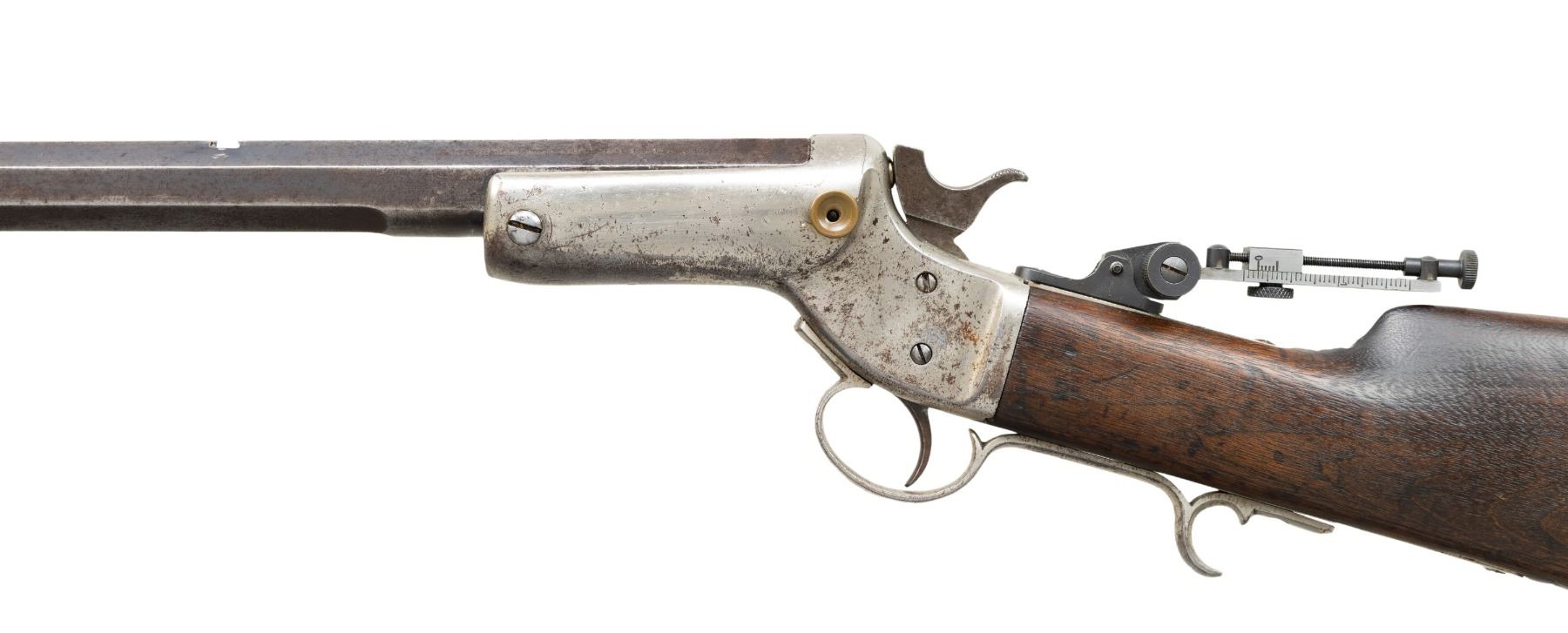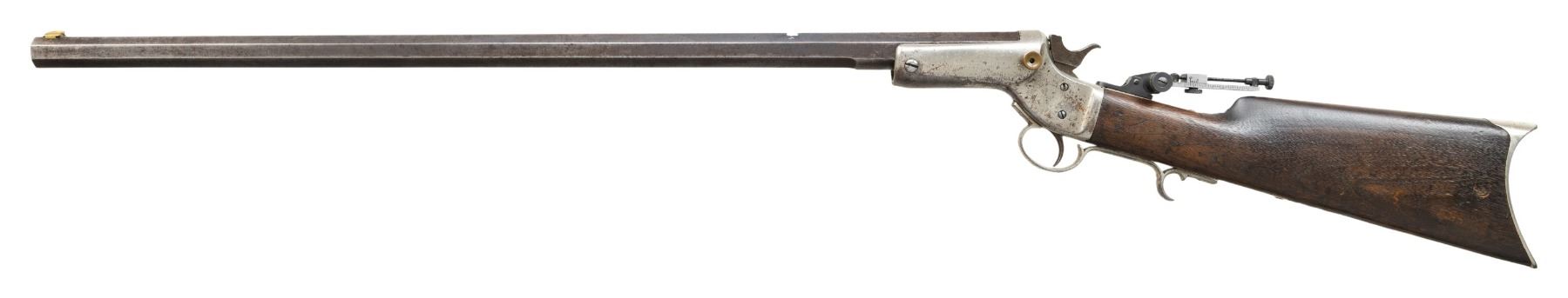Cal. 44 Long CF. S# 7555. Non-matching oct. 26" w/out forearm. Brass blade front sight, open rear dovetail & modern vernier tang sight. Nickel finished action w/ finger curl triggerguard; replacement opening button Walnut buttstock w/ crescent nickel buttplate; stamped "89" on right side. CONDITION: barrel has gray patina appearance with edge wear, scratches from previous rear sight & pinprick oxidation. Fair nick with large areas of faded finish with patina, marks & scratches. Wood has scratches & sm. gouges. Fair worn rifling. PROVENANCE: Estate of Groves Herrick. (01-28376/MD). ANTIQUE. $300-500.