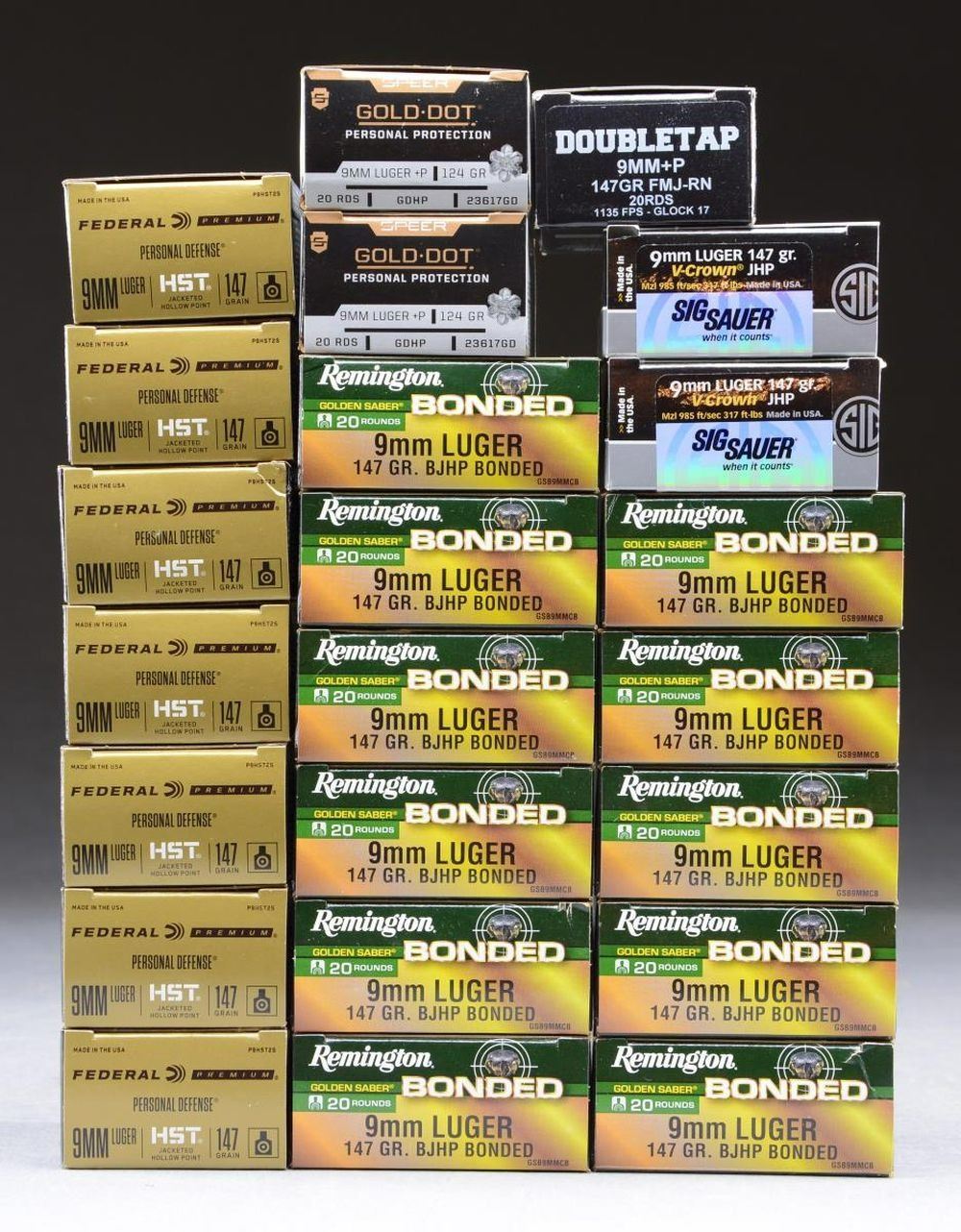 LOT CONTAINS HOLLOW POINT AMMUNITION. 220 RDS. (11 BOXES) Rem. Golden Saber Bonded 147 gr. BJHP Bonded. 140 RDS. (7 BOXES) Federal Personal Defense 147 gr. HST jacketed hollow point. 40 RDS. (2 BOXES) Speer Gold Dot 9mm Luger +P 124 gr. GDHP. 20 RDS. (1 BOX) Doubletap 147 gr. FMJ-RN. 40 RDS. (2 BOXES) Sig Sauer 147 gr. V-CROWN JHP. CONDITION: boxes very good to near excellent; ammo appears serviceable. PROVENANCE: The Collection of Gun Sport Ltd owned by Jon R. Thomas. (02-20388/MD). $200-350.
