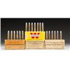 ROUNDS. Cal. 45-70 Govt. (US Cartridge Company). One sealed box of 20 rounds. Tan box & label. Labeling includes "Model 1898 BRASS SHELL / Powder, W.A. SMOKELESS.". / (Frankford Arsenal). One sealed box of 20 rounds. Tan box & label. Labeling includes "CARBINE BALL CARTRIDGES, RELOADING. / TINNED BRASS SHELL. / cleaning instructions". / (Winchester). One two-piece box of 20 rounds. Tan box with orange labeling. Labeling includes "45-70-405 SOFT POINT / SMOKELESS POWDER CARTRIDGES". Cartridges are mostly Winchester except three. / (Winchester). One box of 20 rounds. Yellow box. Labeling includes "45-70 GOVERNMENT / 405 GRAIN SOFT POINT". / 19 loose cartridges headstamped "U.M.C. / SH / 45-70". 500 grain lead bullets. CONDITION: except as noted, boxes will have wear, staining & loose flaps. Ammunition has staining, oxidation & patina. PROVENANCE: The Esteemed Norm Greenberg Collection. (02-24841-7/RW). AMMO. $100-200.