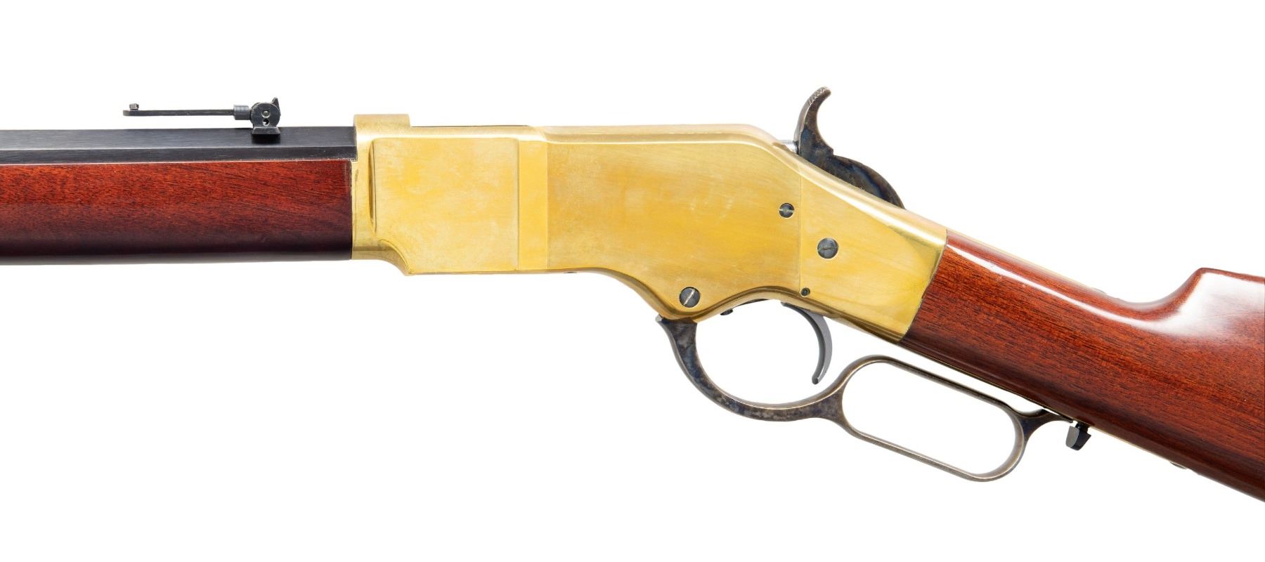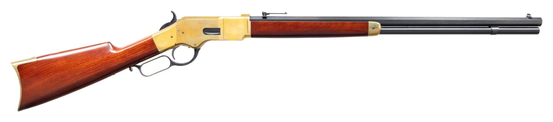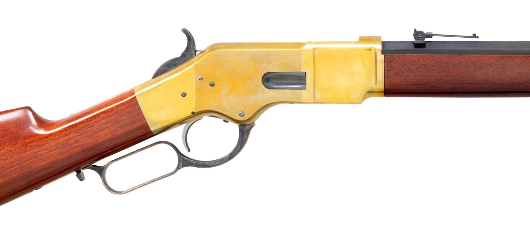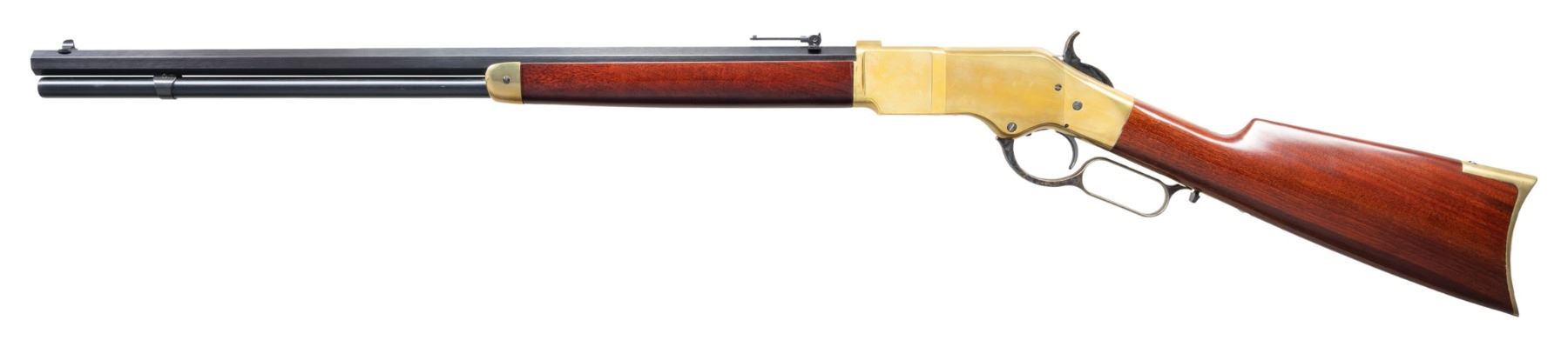 RIFLE. Cal. 45 LC. S# 74218. Mfg. 1998 in Italy. Oct. 24.25 bbl. Blade front sight & ladder rear sight. Tubular mag. Brass finished receiver. Walnut stock set w/ crescent buttplate. CONDITION: very good to near excellent wood & metal finishes with light handling marks. Very good shiny & strong rifling. (25-4467/MD). MODERN. $500-800.
