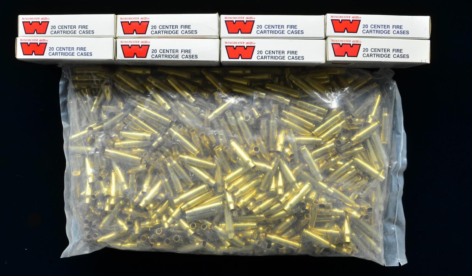 450+ (1 BAG & 8 BOXES) OF 307 WINCHESTER BRASS.