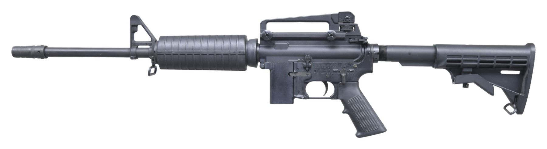 Cal. 45ACP. S# BAZ0108. Bbl. 17.5" over muzzle brake. A 45ACP, blowback operated, Pistol Caliber Carbine (PCC) designed to utilize what appear to be modified grease gun mags. Protected post front sight. Fat, round carbine handguards retained w/ tapered delta ring. Flat top upper receiver w/ round forward assist & brass deflector. Removable carry handle w/ E2, windage & elevation adjustable, dual aperture rear sight. 6 position, telescoping black plastic shoulder stock. Left side safety / selector. Front & rear sling swivels. CONDITION: Finish complete & consistent w/ some thinning in high spots & in some areas of mechanical intervention. Bright bore w/ strong rifling. Fire control mechanism appears to function correctly when cycled by hand. (25-2330/JZ). MODERN. $500-800.