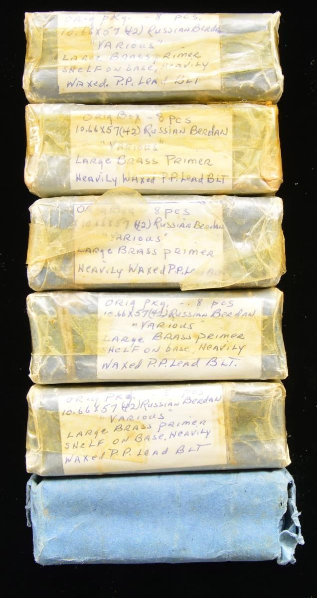 Ammo packages marked (in pen) "10.66x57mm (42) Russian Berdan / Various / Large brass primer / shelf on base / heavily waxed / PP lead Blt". Various headstamps. Measures very close to the 10.75x58mm Russian Berdan. 6 Folded paper packages, most double wrapped in wax paper. CONDITION: wax coated case & projectiles. PROVENANCE: Estate of Frank Glenn Marsh (02-17056-2/JZ). MODERN. $50-100.