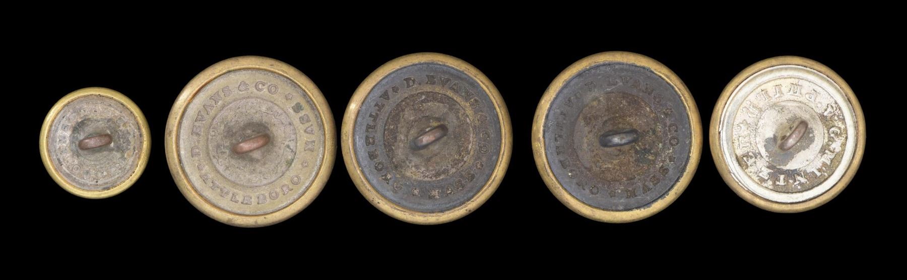 This lot includes 3 large wings-up AVC buttons that depict an eagle with the letters "A.V.C." above. The back marks on these buttons are D. EVANS. 1 Coat-size example with a back mark that reads RMDC "W G . MINTZER * PHILD.. ." 1 Cuff-size example of the wings-up version with a ROBINSONS backmark. CONDITION: buttons generally retain nearly all of their original gilded finish. PROVENANCE: Luis F. Emilio estate collection. (02-23227-4/BF). $1,500-2,000.