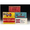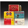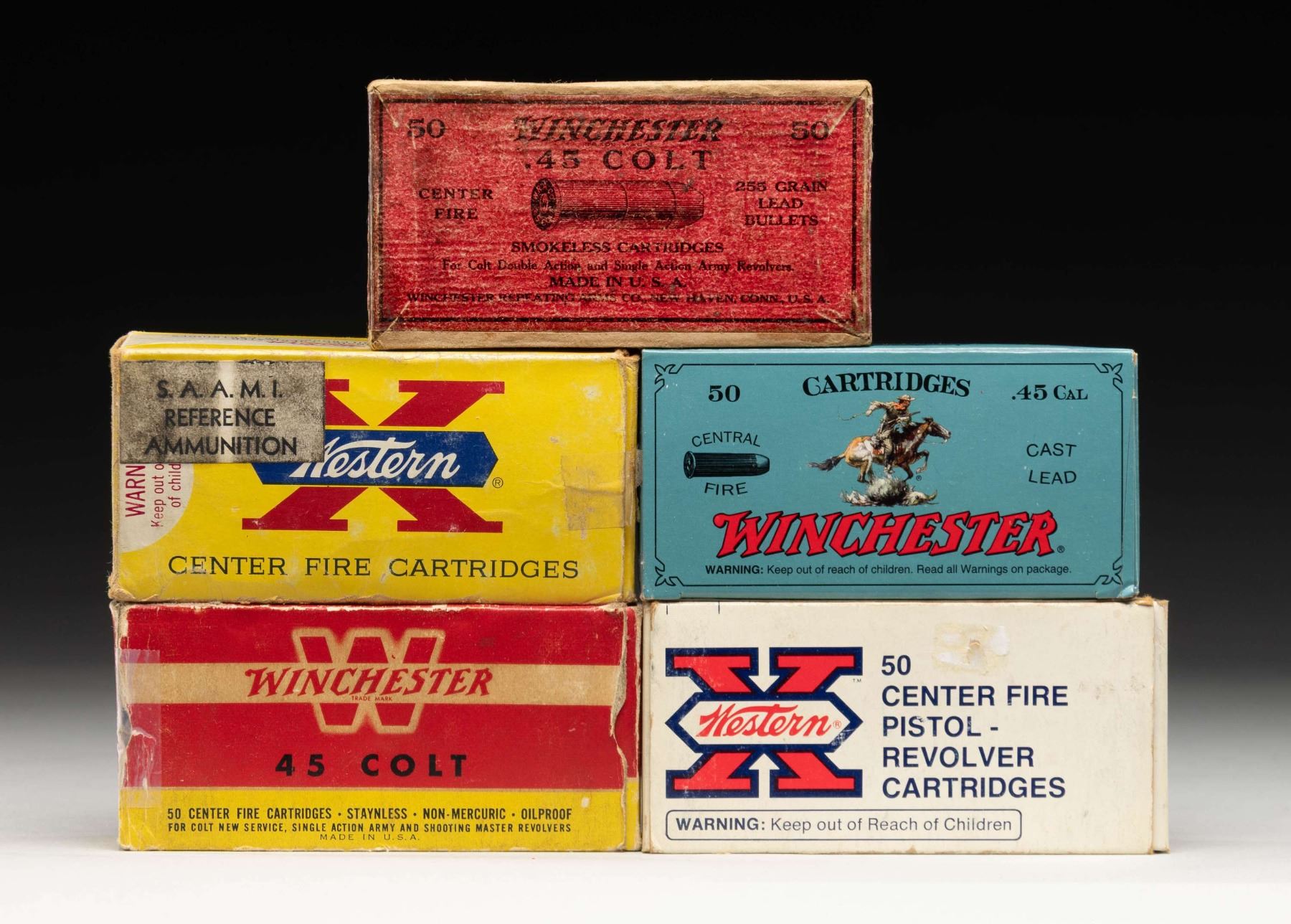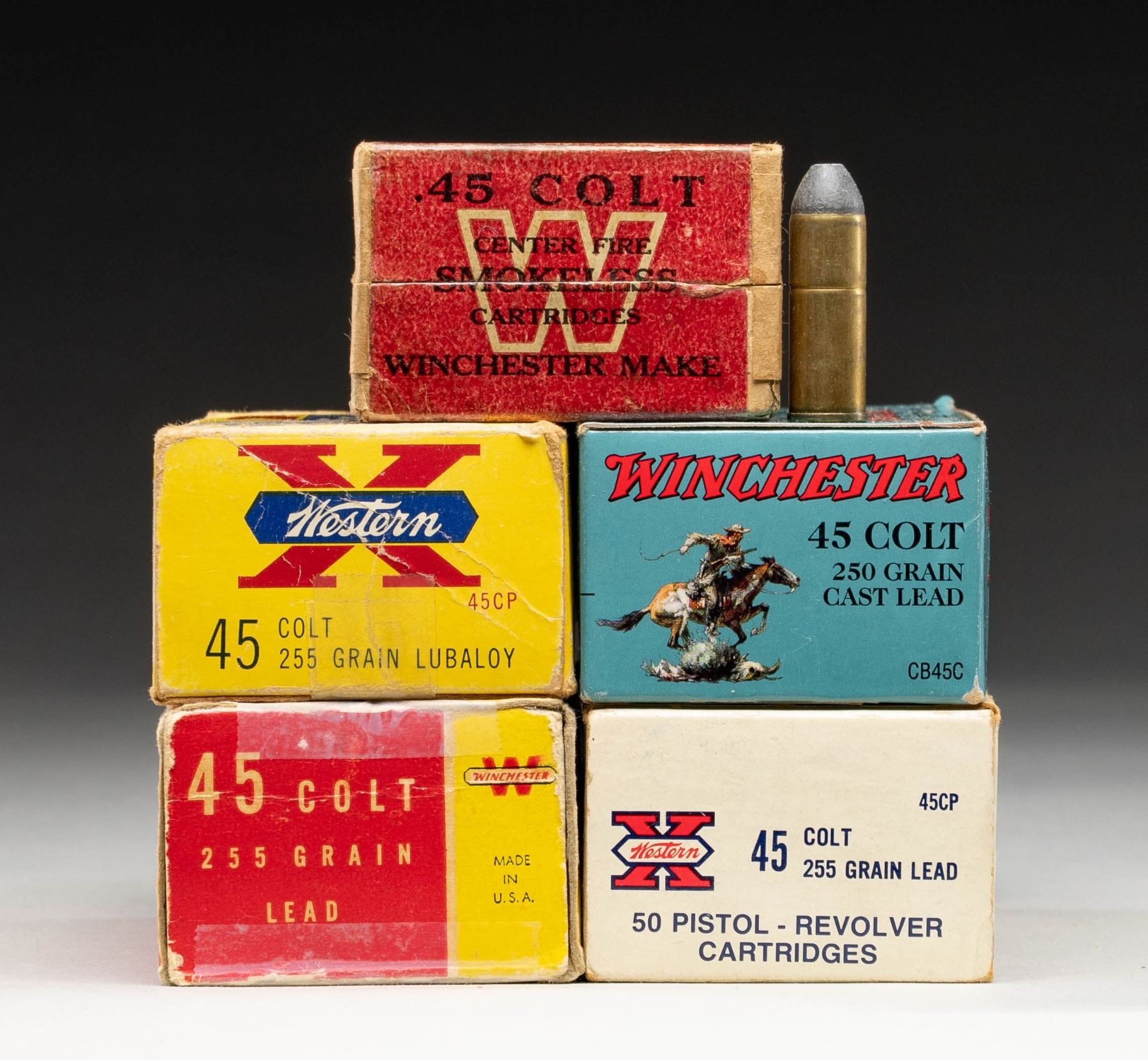 All in good serviceable condition; 50 round boxes. Partial boxes and particulars listed individually; all 255 grain lead bullets unless noted. 1). Western X; white box. 2). Winchester Cowboy Action Loads; blue box. 3). Winchester W with dome profiled silver primers; red / yellow box. Reattached end flaps on box. 4). Western X; yellow box of 37 rounds with sticker added to box stating: "S.S.S.M.I. REFERENCE AMMUNITION". Winchester red labeled 2 piece vintage box with headstamps of "W.R.A. Co. 45 COLT" but mixture of dome profiled brass colored primers and copper colored ones. PROVENANCE: The Esteemed Norm Greenberg Collection. (02-24841-8/NW). $150-250.