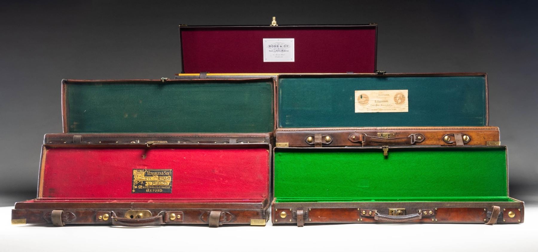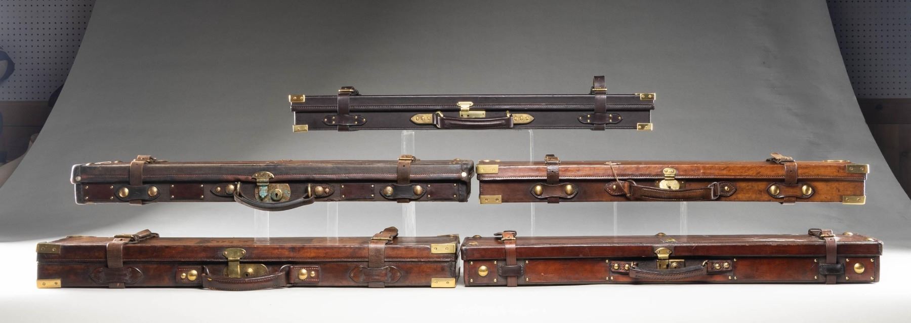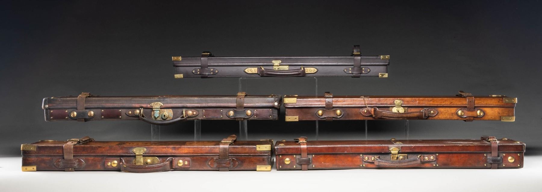 1) Leather case nicely conserved and with brass tack enhancement; lined in green cloth. SIZE: made for 30" barrel gun. CONDITION: very fine as attractively restored. Straps and handle are new as is interior cloth. 2) Leather case with brass corners; lined in green cloth with rare "E. Fletcher" label in lid. SIZE: fitted for 30" hammer gun. CONDITION: good. Leather still light in color with some stains. Straps and handle are good. Interior cloth shows some discoloration and stains. Label is somewhat foxed and has a rub through. 3) Leather trimmed canvas case with leather panel and brass tack enhancement. Lined in green cloth. SIZE: will except 30" barrel hammerless gun. CONDITION: very fine as conserved with new straps and old handle. Interior cloth is somewhat stained. 4) Leather case with brass corners; embossed F.A.G. J on lid. Lined in scarlet cloth. A rare gold embossed black leather "Venables & Son" label is in lid. SIZE: configured for a 30" percussion gun. CONDITION: leather dark with stains and rubs; has been conserved. Straps and handle are good. Interior cloth shows some insect damage and soiling. Label is very fine with some minor rubs. 5) High quality recently made oak and dark leather case with brass corners. Interior is lined in burgundy cloth. A reproduction Boss label is in lid. Bottom compartment is French fitted for turn screws and contains a key. SIZE: 30" barrel gun. CONDITION: exceptionaly fine. Appears "near new". PROVENANCE: From the Private Collection of Berrien Moore III. (02-25883-2/MGM). $600-1,200.
