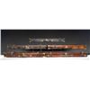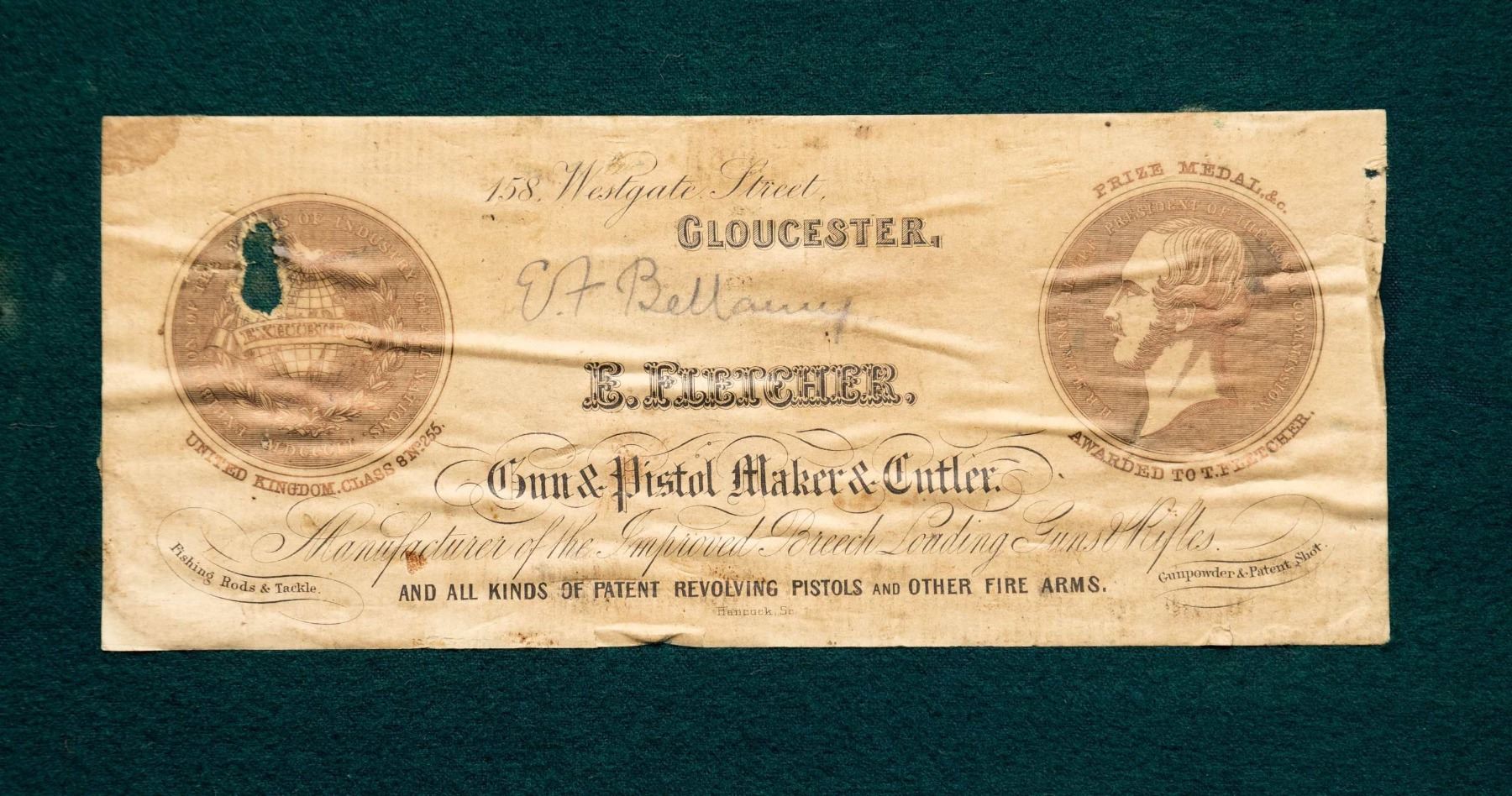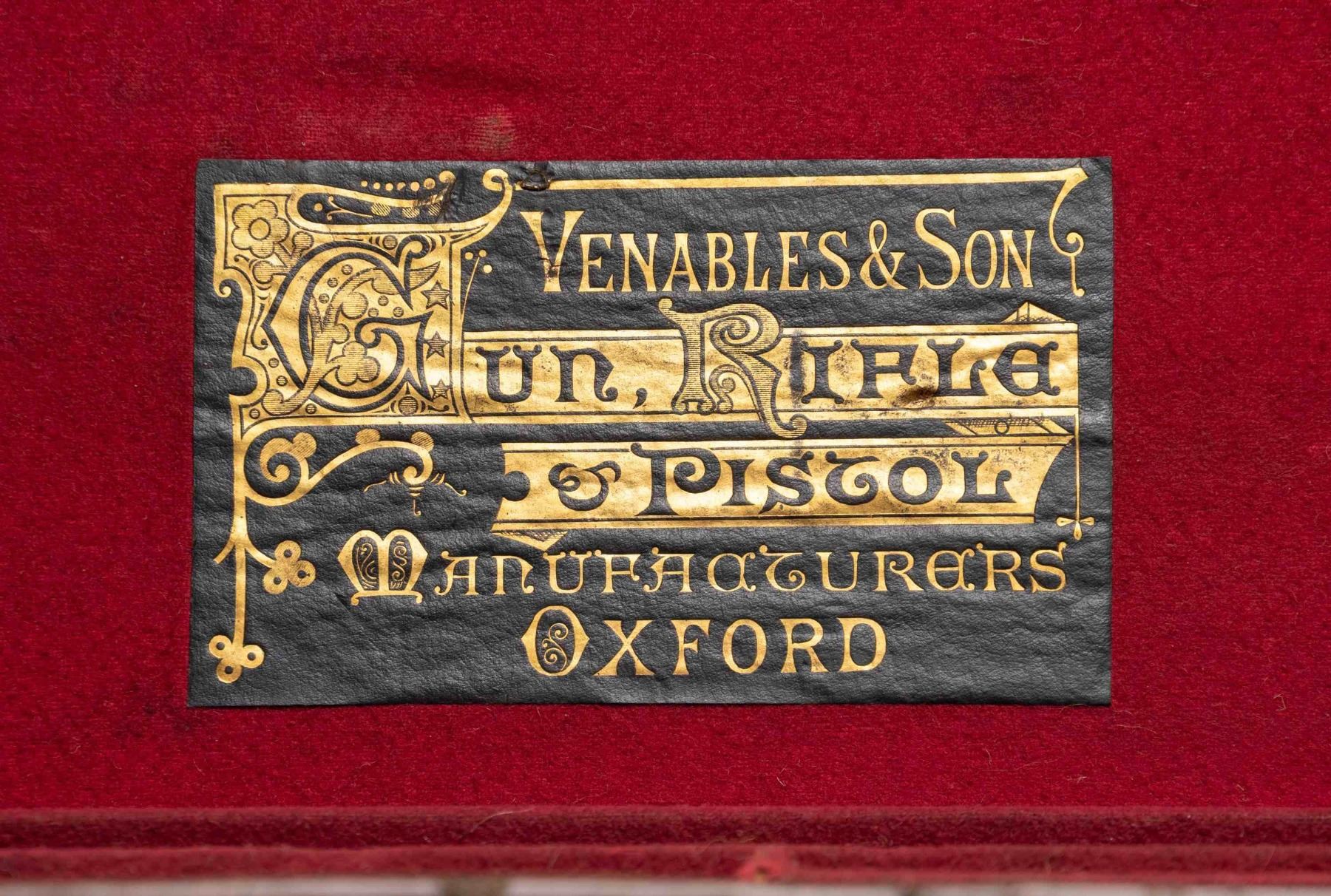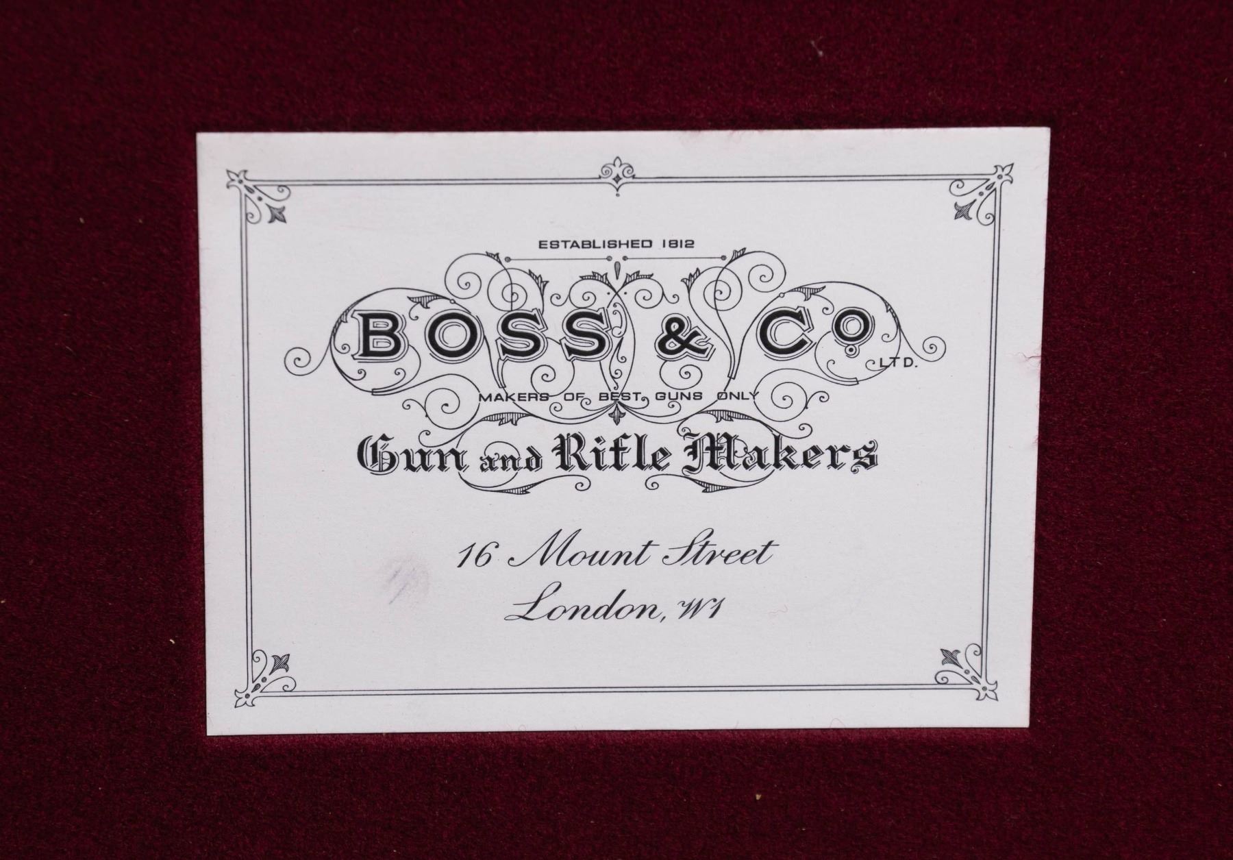 1) Leather case nicely conserved and with brass tack enhancement; lined in green cloth. SIZE: made for 30" barrel gun. CONDITION: very fine as attractively restored. Straps and handle are new as is interior cloth. 2) Leather case with brass corners; lined in green cloth with rare "E. Fletcher" label in lid. SIZE: fitted for 30" hammer gun. CONDITION: good. Leather still light in color with some stains. Straps and handle are good. Interior cloth shows some discoloration and stains. Label is somewhat foxed and has a rub through. 3) Leather trimmed canvas case with leather panel and brass tack enhancement. Lined in green cloth. SIZE: will except 30" barrel hammerless gun. CONDITION: very fine as conserved with new straps and old handle. Interior cloth is somewhat stained. 4) Leather case with brass corners; embossed F.A.G. J on lid. Lined in scarlet cloth. A rare gold embossed black leather "Venables & Son" label is in lid. SIZE: configured for a 30" percussion gun. CONDITION: leather dark with stains and rubs; has been conserved. Straps and handle are good. Interior cloth shows some insect damage and soiling. Label is very fine with some minor rubs. 5) High quality recently made oak and dark leather case with brass corners. Interior is lined in burgundy cloth. A reproduction Boss label is in lid. Bottom compartment is French fitted for turn screws and contains a key. SIZE: 30" barrel gun. CONDITION: exceptionaly fine. Appears "near new". PROVENANCE: From the Private Collection of Berrien Moore III. (02-25883-2/MGM). $600-1,200.