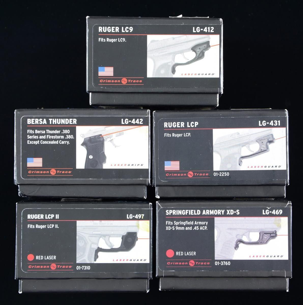 All 5 in original boxes w/ instructions & accessories which include allen wrenches & cotton swab tip cleaners. Sights are for the following pistols: 1) Ruger LC9 LG-412. 2) Ruger LCP LG-43. 3) RUGER LCP II LG-497. 4) SPRINGFIELD ARMORY XD-S LG469. 5) BERSA THUNDER LG-442. CONDITION: near new in box. PROVENANCE: The Collection of Gun Sport Ltd owned by Jon R. Thomas. (02-20761/RW). $700-1,000.