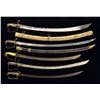 1) MILITIA. Overall length: 33 1/2". Blade length: 29". Single fuller blade. Brass hilt w/ bird’s head pommel. Wood grip. No scabbard. CONDITION: blade has a dark, pitted patina. Hilt is loose & a bit misshaped. Grip has no wire or leather. Wood is nearly complete. 2) EAGLE HEAD. Overall length: 34". Blade length: 28 1/2". Single fuller blade. Gilded brass hilt w/ lg. attractive eagle head pommel. Certifiably antique ivory grip. No scabbard. CONDITION: blade has a dark oxidized patina. Hilt has a dark patina mixed w/ about 25% original gilding. Grip appears to have been lacquered. 3) BLUCHER TYPE. Overall length: 39 1/4". Blade length: 33". Single fuller blade. Iron hilt w/ ears on backstrap. Leather covered grip. Iron scabbard. CONDITION: blade has a medium gray mottled patina w/ oxidation near the tip. Hilt has a dark patina. Grip & scabbard have been painted. Scabbard body has a few rust holes & cracks. 4) MILITIA. Overall length: 36 1/4". Blade length: 31 1/2". Single fuller blade. Iron hilt w/ languets & ears on the backstrap. Wire wrapped, leather covered grip. No scabbard. CONDITION: blade has a medium gray mottled patina. 1 Languet is missing. Leather is approx. 60%. Wire is complete. 5) MILITIA. Overall length: 41". Blade length: 36". Single fuller blade marked on the spine, “Sold by C & J D Wolfe New York”. Brass bird’s head pommel hilt. Leather wrapped grip. Brass mounted leather scabbard. CONDITION: blade has a medium gray mottled patina. Hilt & scabbard mounts have a dark mustard patina. Grip leather is about 10% intact. Wood grip is cracked. Scabbard is reasonably solid & complete though a bit flexed & shrunk. (02-14360(5)/BF). $1,000-1,300.