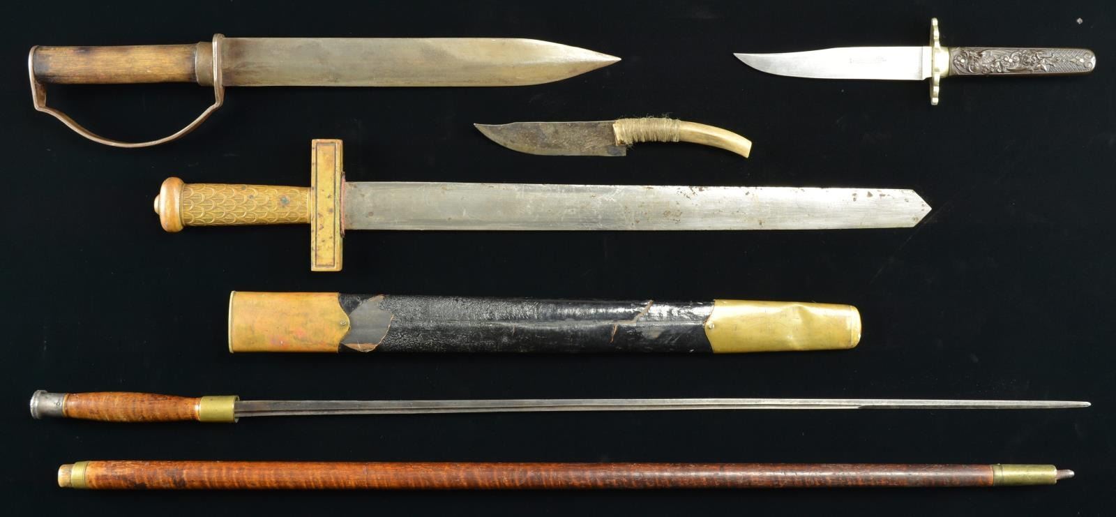 1) SWORD CANE. A well made sword cane measuring 37 1/2" in overall length with a 26 3/4" blade that fits neatly into the shaft of the figured maple cane. The cane top is silver and originally engraved with initials that are now difficult to read. The ferrule and tip are brass with 1/2" iron protrusion at the base. CONDITION: cap is heavily worn, but the balance of the cane shows light wear.