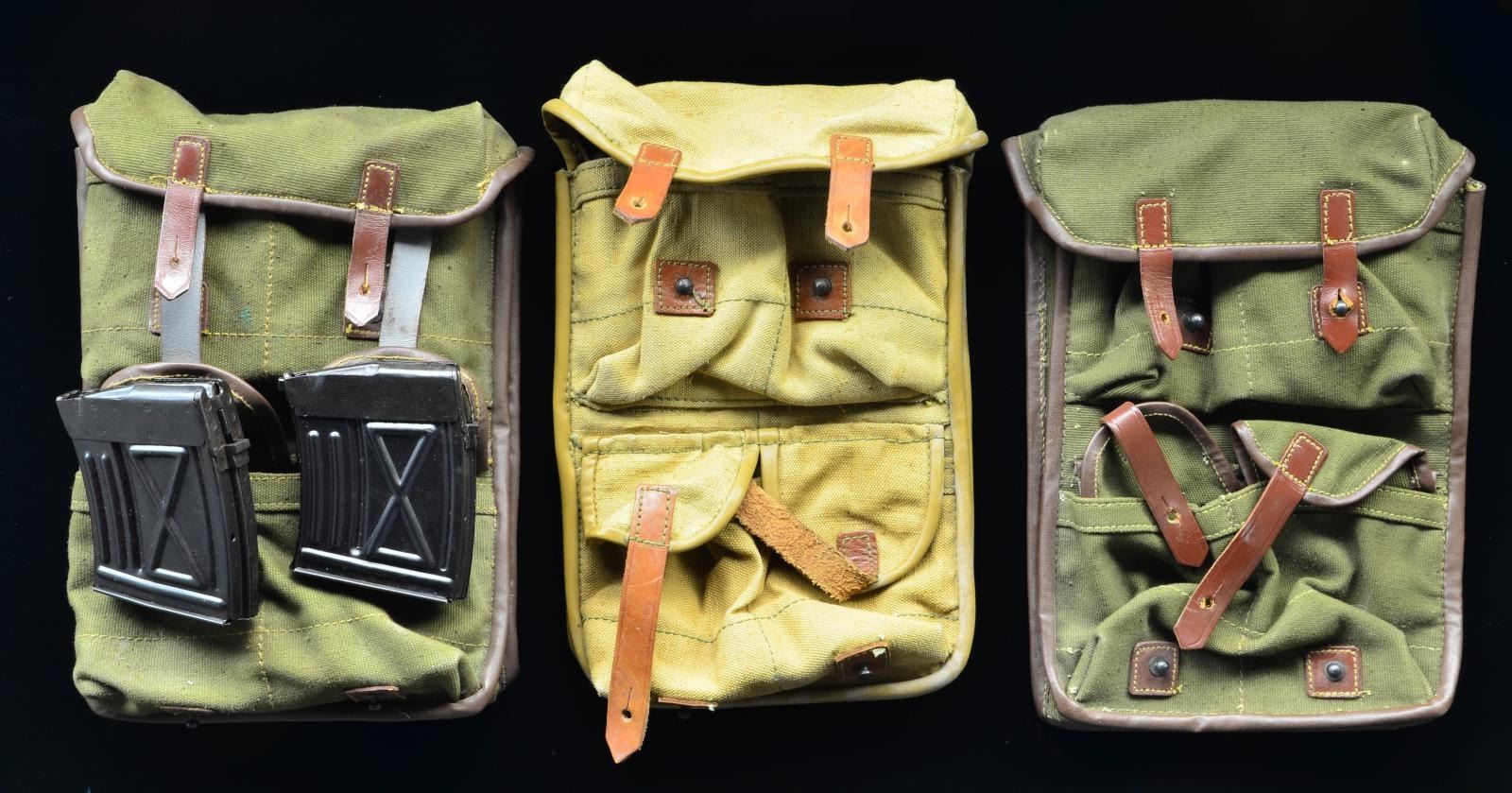 CASES. Lot of 5 Dragunov PSL magazines. 10rd capacity. These are the ones w/ the "Double Line w/ X" ribbed pattern. All dark black. Steel construction. Also included are 3 canvas mag pouches, 2 green and 1 tan. Each hold 4 magazines. In them are a total of 1 brown leather sling, 1 steel oil flask, 2 sets of cleaning rods & 3 capsule-style cleaning kits. CONDITION: Everything is in "as issued" condition. Dark black finish w/ engraved numbers on front. (3 - C-1707 & 2 - C2650). (02-16810-6/JZ). $150-300