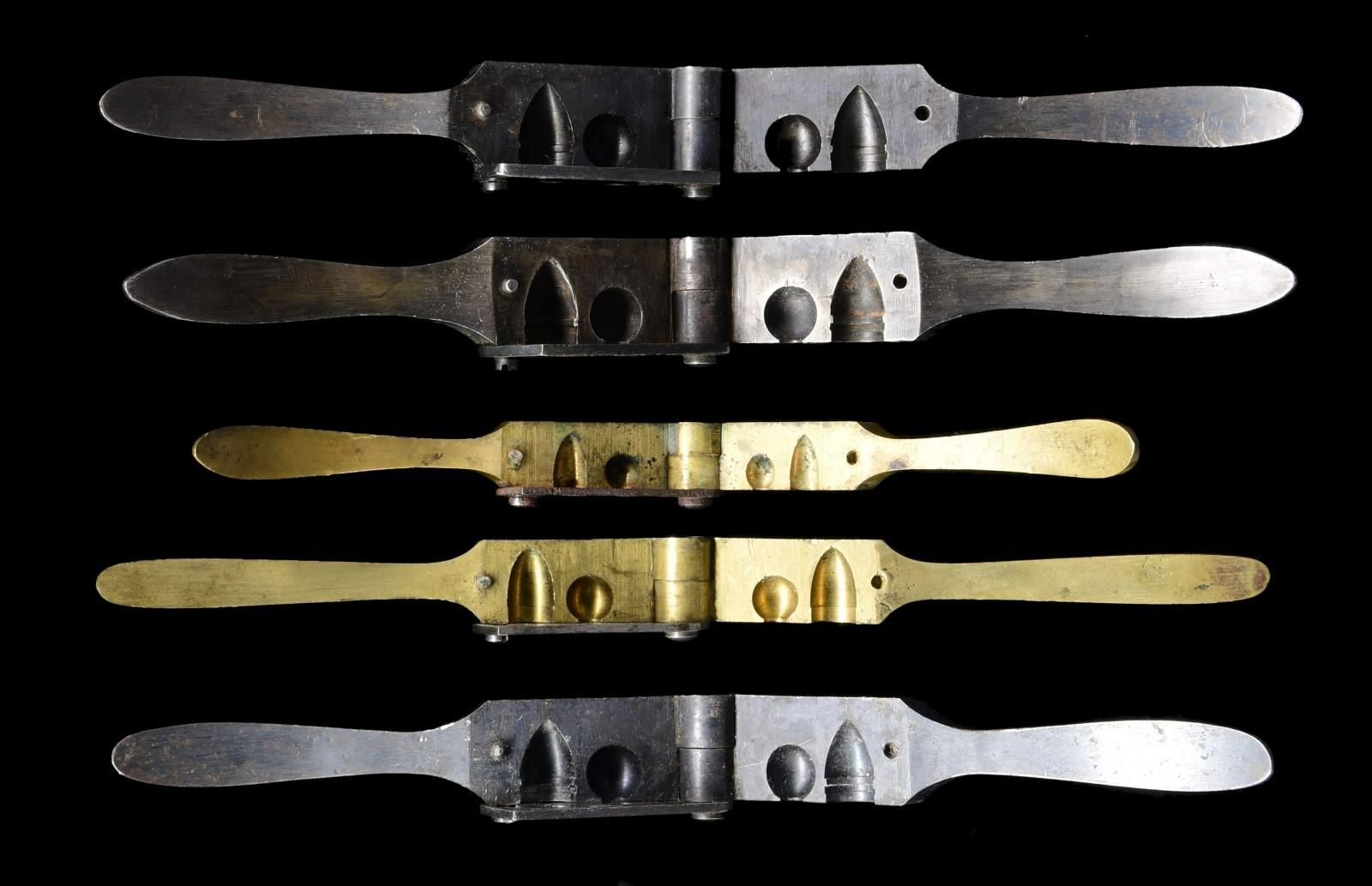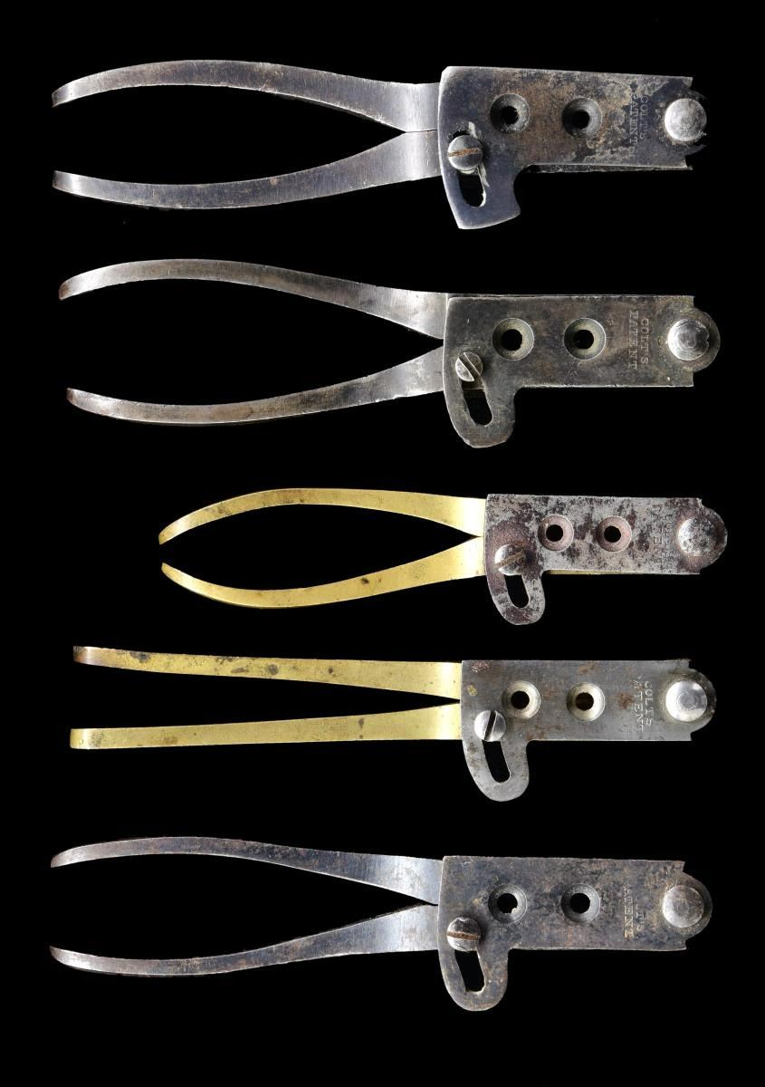3 COLTS PATENT 1860 Army molds, 2 civilian marked "44H" and one military with "C" inspector mark. Rare & fine condition brass model 1851 Navy mold with "COLTS PATENT" steel sprue cutter, small "W" stamped on steel, Rapley M#22. Brass model 1855 .28cal, small "H" stamped on right block. CONDITION: Root & one civilian army molds are good-very good. The other 2 army molds are fine & retain 60-70% blue finish. The navy mold is fine, some cosmetic stains & small dents, sprue cutter is mostly bright as finished "in the white" with small areas of staining & pitting. PROVENANCE: Martin Lane Historic & Western Americana Lifetime Collection. (02-22014/JS). $1,000-2,000.