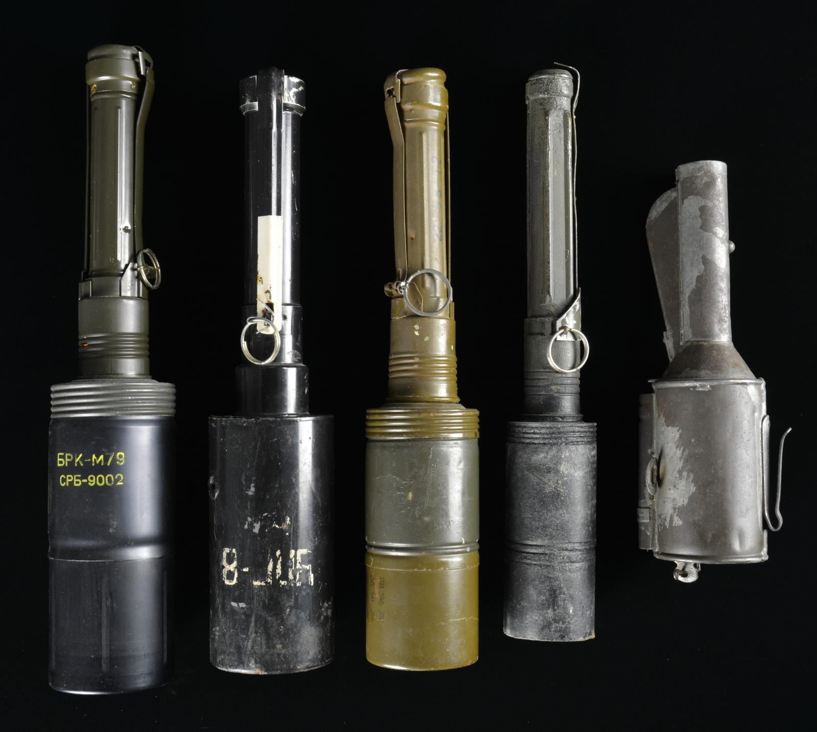 5 INERT / TRAINING RUSSIAN STYLE STICK GRENADES.