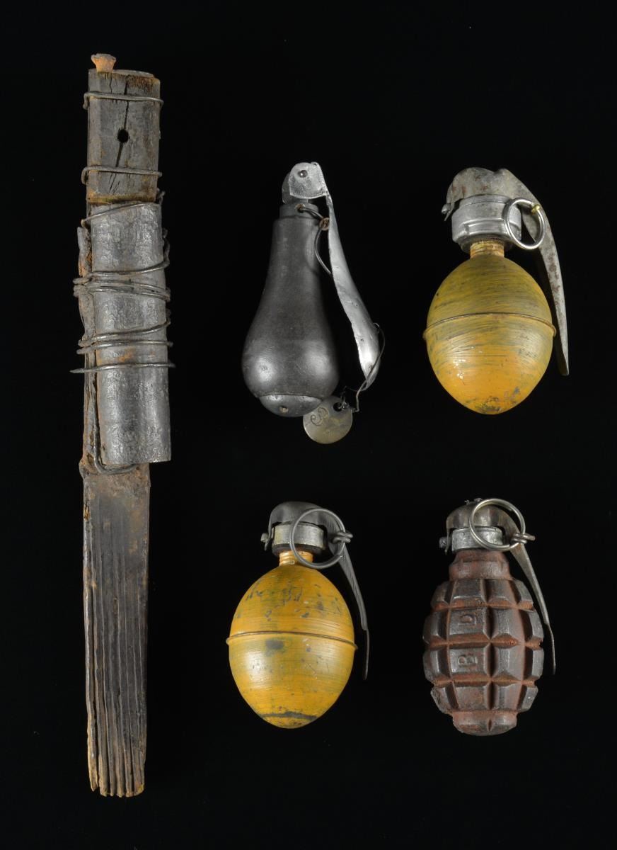 4-5) OF1. "Egg" shaped style of grenades w/ sheet metal yellow painted bodies. 1916 "Brilliant" fuses w/ replacement safety pins. CONDITION: the petard grenade is rather worn & pitted w/ oxidation, others are good w/ handling marks, flaking finish & holes. (02-16270-2/MD). $500-750.